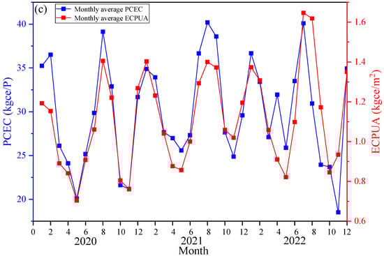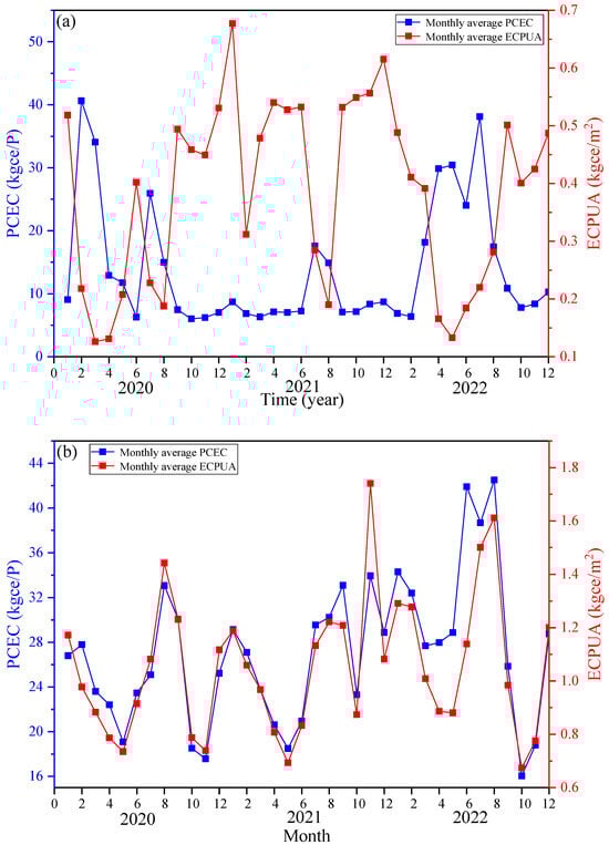 Monthly change curve of PCEC and ECPUA in public institutions: (a) Educational institutions; (b) Administrative institutions; (c) Medical institutions.