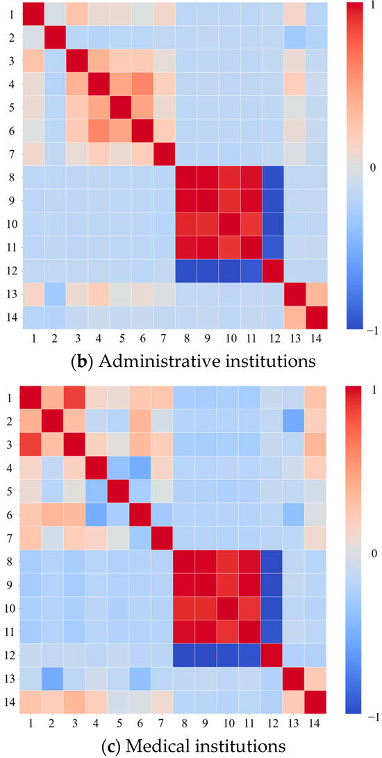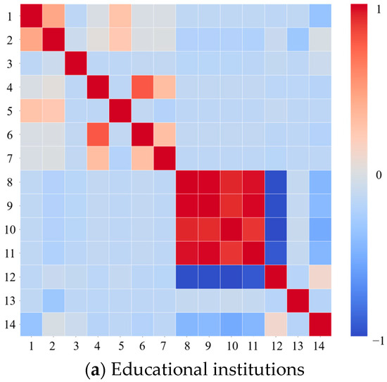 Pearson correlation analysis results of influencing factors of public institutions. Features 1 to 14, respectively, represent building area, number of energy users, headcount, number of gasoline vehicles, number of diesel vehicles, number of new energy vehicles, number of charging stations, average high temperature, average low temperature, extremely high temperature, extremely low temperature, air quality, energy consumption per unit building area, and per capita energy consumption. Among them, features 1 to 13 are consistent with Table 1.