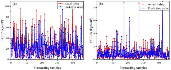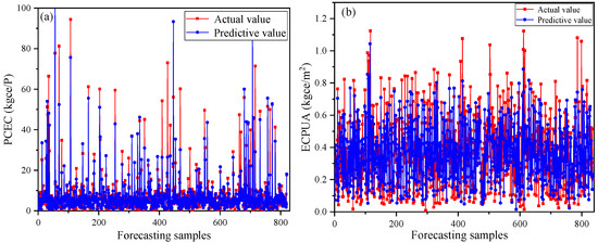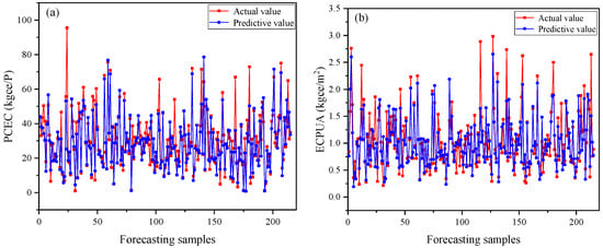 Comparison between predicted values and reality of medical institution: (a) Monthly per capita energy consumption; (b) Monthly energy consumption per unit area.