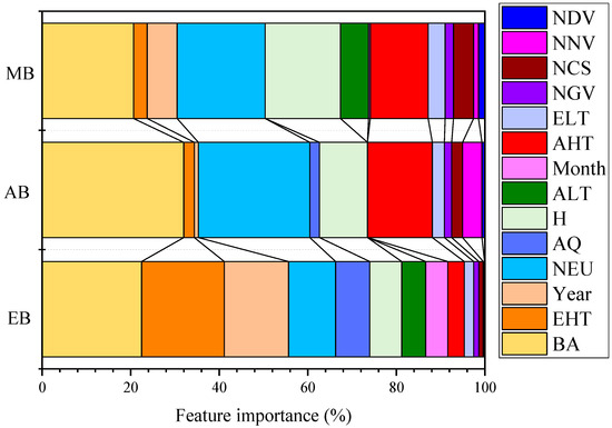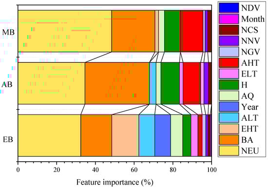 Feature importance analysis is of great significance for evaluating the global interpretability of models. Figure 9 and Figure 10 demonstrate the feature importance of the global perspective based on SHAP model for predicting carbon emission intensity of various institutions (only the 14 most influential factors were shown in the figure). The energy consumption patterns of educational institutions exhibited significant personnel led characteristics. The NEU occupied an absolute dominant position in per capita energy consumption predictions, reflecting the essential characteristics of personnel density in educational activities. BA, as a key indicator of infrastructure carrying capacity, together with personnel factors constituted the dual core driving force of educational energy consumption. It is worth noting that the importance of EHT went beyond conventional climate variables, reflecting the special vulnerability of educational institutions under extreme climate conditions, and it might be closely related to summer school activities and centralized use of air conditioning systems. Administrative institutions exhibited a more balanced multi-factor driving model. NEU and BA were almost equally important, reflecting the dual dependence of administrative office energy consumption. The prominent importance of NV revealed the significant role of administrative transportation in energy consumption, which was relatively weaker in other types of institutions. In temperature variables, the importance of AHT exceeded that of extreme temperature, indicating the sensitivity of administrative agencies to conventional seasonal climate change. The energy consumption of medical institutions presented a highly personnel intensive characteristic, with the importance of NEU reaching the peak among the three types of institutions, highlighting the extreme dependence of medical services on human resources. The importance of BA was relatively balanced, while the significant impact of AHT reflected the strict temperature control requirements of medical institutions, which were directly related to the operating environment of medical equipment, drug storage conditions, and patient comfort needs.