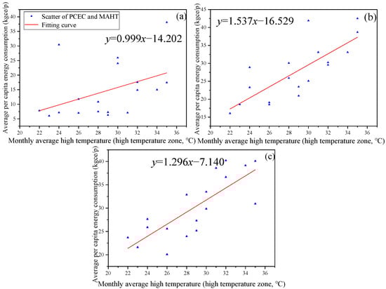 The relationship diagram between PCEC of different institutions and AHT in high temperature zones. (a) Educational institutions; (b) Medical institutions; (c) Administrative institutions.
