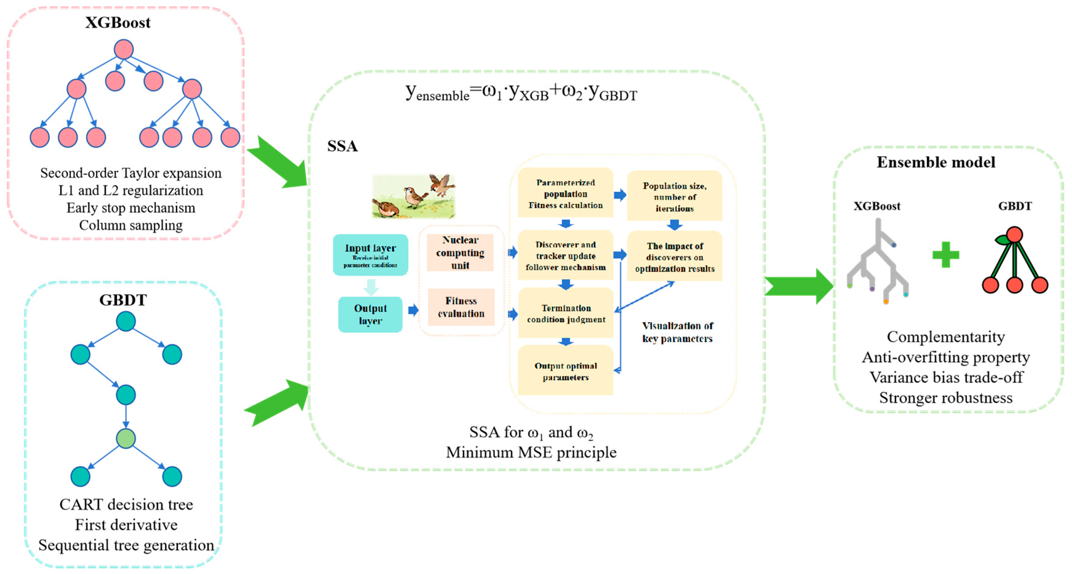 28]. Therefore, for specific datasets, GBDT may have better regression performance. The XGBoost and GBDT, trained separately, were weighted and combined. The optimal values of weights ω1 and ω2 were searched for based on a sparrow search algorithm (SSA). The goal of the optimization algorithm was to minimize mean squared error (
