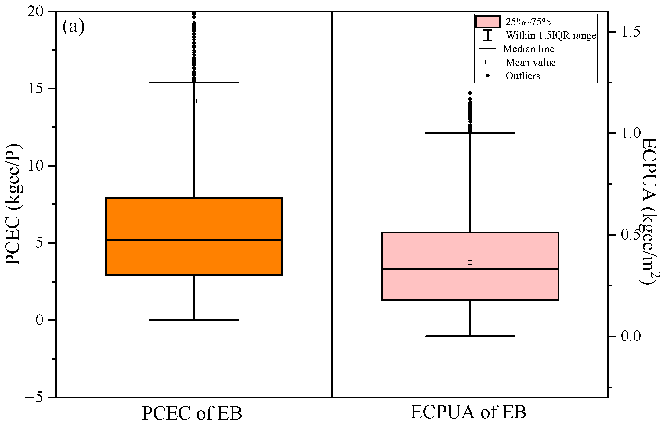 2. It could be seen that the difference between the average and median ECPUA of EI was smaller compared to the difference in PCEC, because the overall numerical magnitude of the unit building area was smaller and more concentrated.