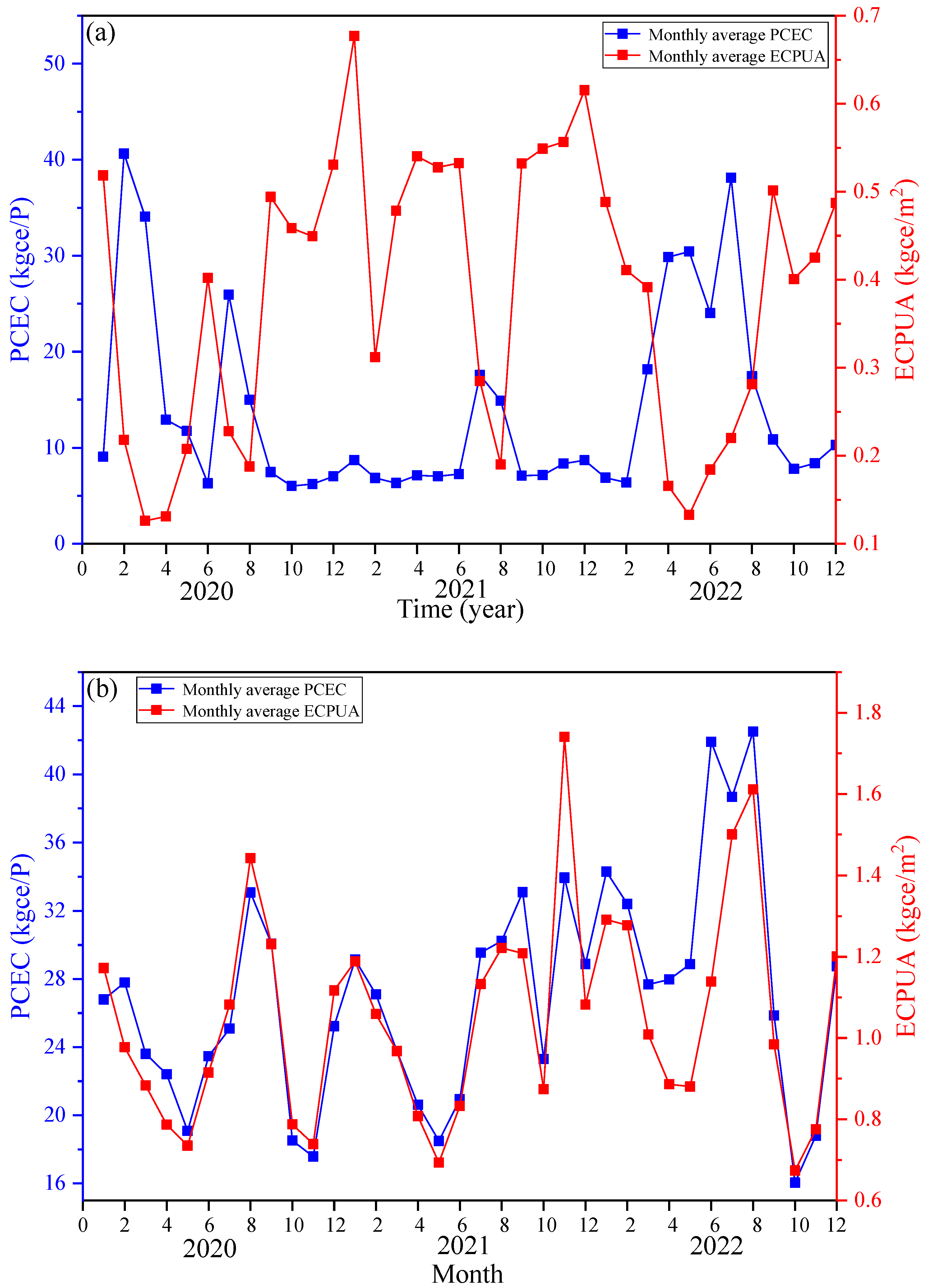 For PCEC, EI had the lowest energy consumption among the three types of buildings, ranging from 0 to 20 kgce/P. This was often related to the low-energy consumption behavior of personnel in EI and two long holidays every year. The monthly PCEC of MI was the highest, ranging from 0 to 100 kgce/P, with an average of 29.8 kgce/P. It was consistent with our previous research [