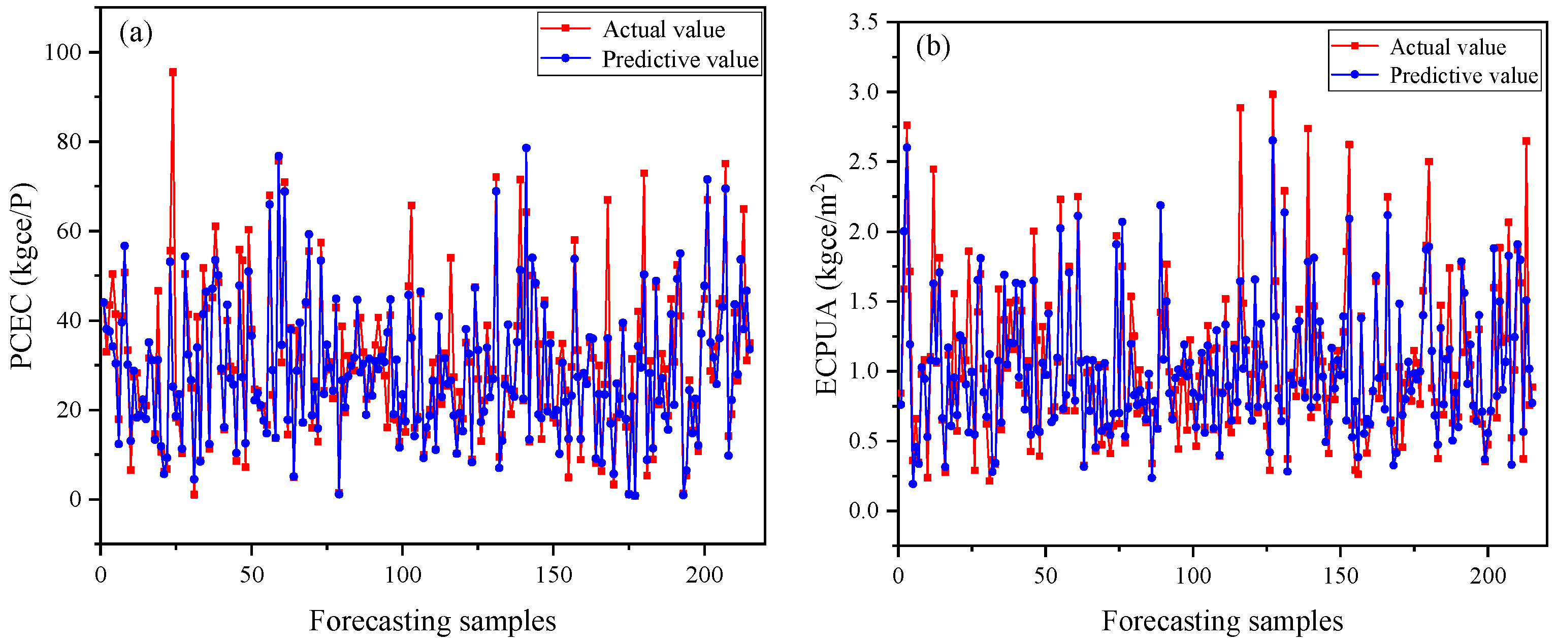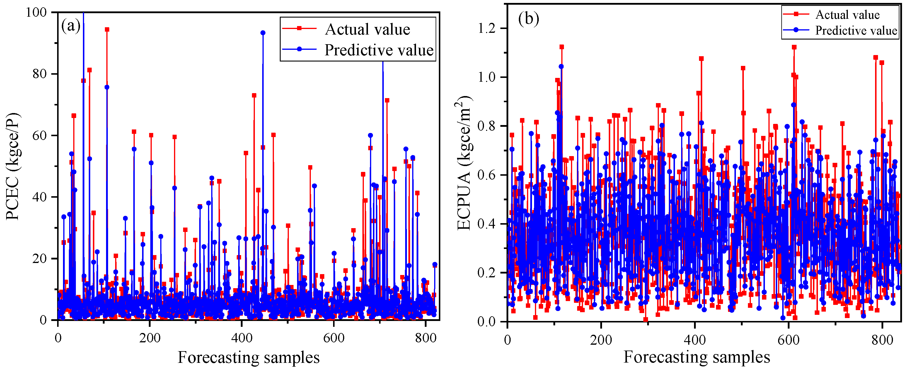 Figure 8 present a comprehensive comparison between the predicted values and actual measurements of monthly per capita energy consumption and monthly energy consumption per unit area across three distinct institutional types using the optimized ensemble model. The scatter plots demonstrated a strong alignment between predicted and actual values, with data points clustering closely along the diagonal reference line, indicating the model’s robust predictive accuracy. This close correspondence was particularly evident in the educational institution data (