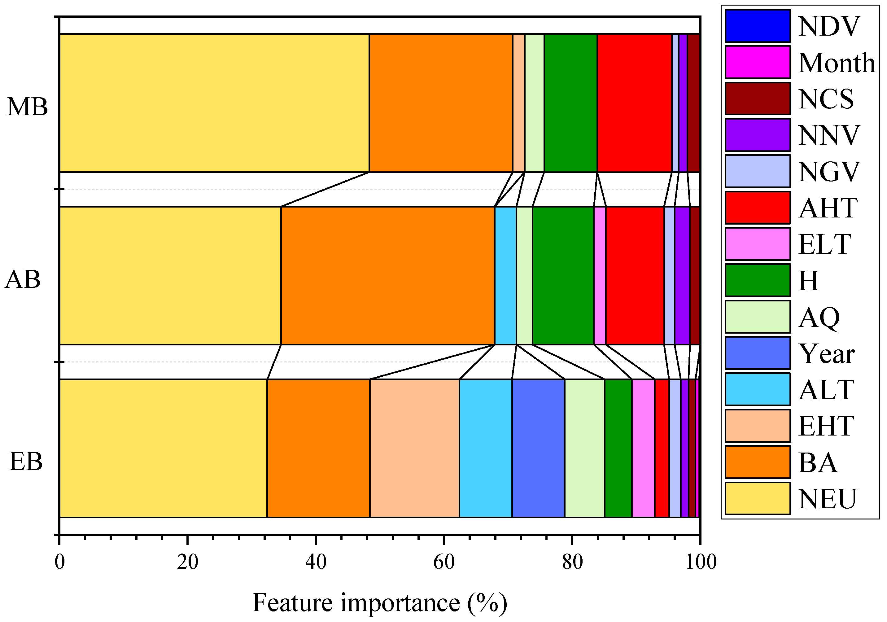 In order to enhance the generalization of the model, the study used samples from 2020 and 2021 as the training set and samples from 2022 as the testing set. During the model training process, a 5-fold cross validation method was used. In addition, based on the VIF results of the features and to avoid the risk of data leakage, EC, WC, and NV were excluded from the features in the study. Due to the right-handed distribution of energy consumption data, in order not to affect prediction performance, logarithmic transformation was performed on the energy consumption data before training. And the data was inverse transformed after training and prediction. The predictive performance parameters were calculated based on actual data.