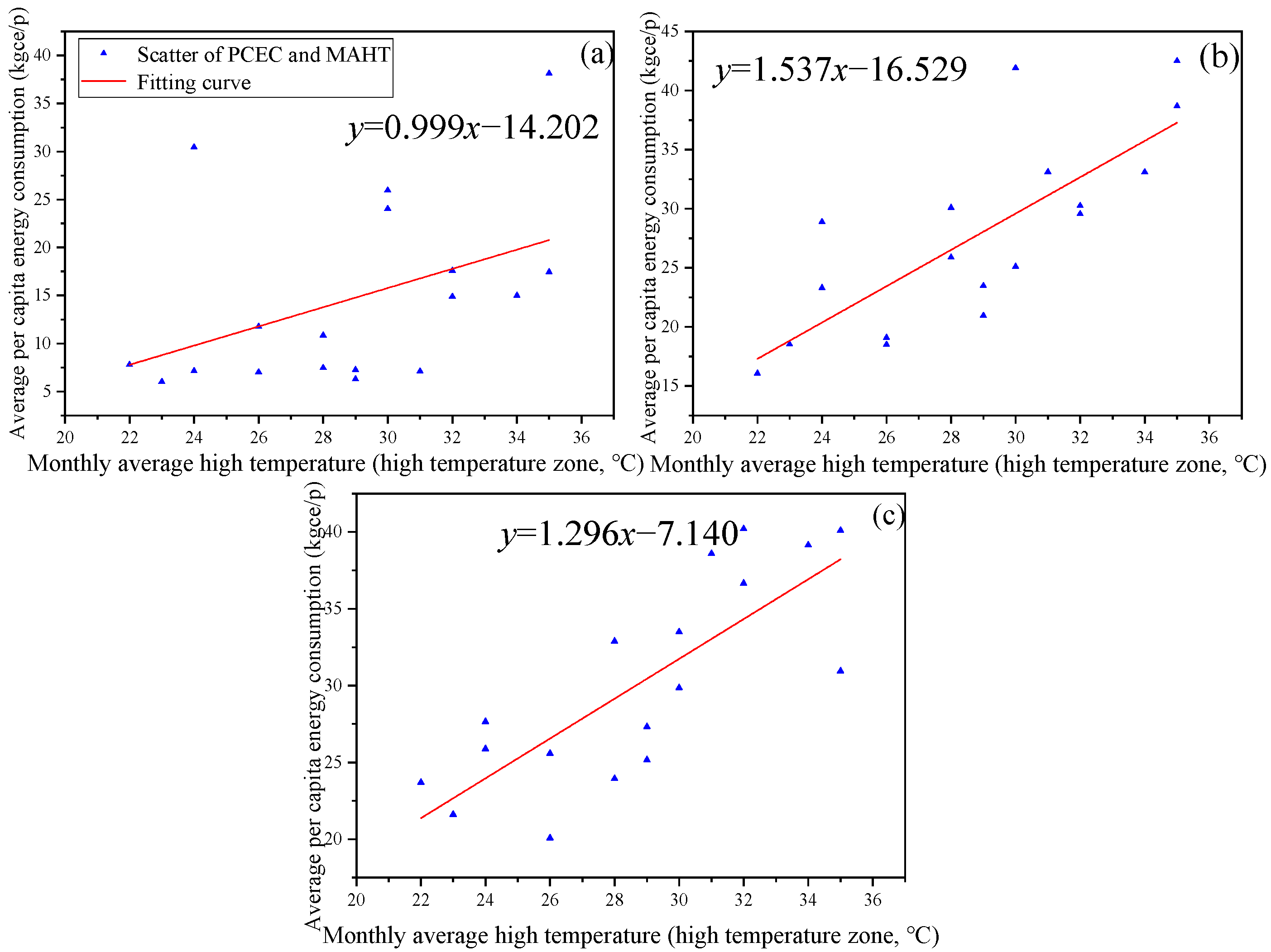 Their linear formulas are y = 1.537x + 16.529 and y = 1.296x − 7.140. The slopes all exceed 1. Furthermore, from the intercept, it can be seen that at the same temperature, the PCEC of MI was higher. This is consistent with the previous conclusion. In addition, the slope of the linear relationship between their low temperature zone temperature and PCEC is higher than −1. This indicates that the impact of extreme heat on PCEC was greater than that of extreme cold.