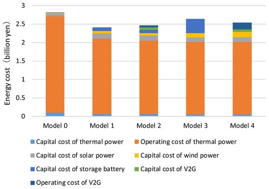 Model 2, which incorporates V2G under the cost-minimizing condition, showed a slightly higher total cost than Model 1 because of additional EMS/VPP capital and degradation-related costs. However, lower thermal fuel expenditures partially offset these costs. In the CO2-minimizing cases, the total costs increased moderately as the wind capacity expanded, but Models 3 and 4 remained less expensive than the baseline. Model 4 achieved the lowest emissions at a total cost of 2.54 billion yen, demonstrating that additional CO2 mitigation through V2G can be realized at a relatively small incremental cost. The differences in total costs among Models 1–4 were modest, indicating that the system has reached a near-optimal balance between renewable investment and thermal operation. A more detailed discussion of installed capacities and thermal generation behavior is provided in Section 3.3.
