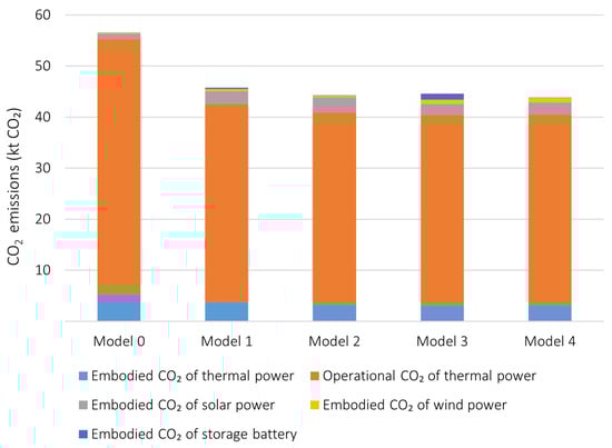 Figure 4 shows the breakdown of annual CO2 emissions for each model. Thermal generation accounts for most annual CO2 emissions, primarily from fossil fuel consumption during power generation. The total annual emissions decreased from 56.5 kt CO2 in Model 0 to approximately 44–45 kt CO2 in the optimized cases. These differences primarily resulted from variations in renewable energy and storage capacities among the optimized models. The lowest value, 43.8 kt CO2, was obtained in Model 4, confirming the additional emission reduction potential of V2G integration. The introduction of V2G consistently improved system performance by enhancing flexibility and enabling more effective use of renewable energy. However, similar to the total system cost, the differences in emission reductions among Models 1–4 were limited, which also resulted from the lower-bound constraint on thermal generation, as discussed in Section 3.3.