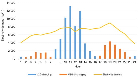 Figure 6 shows the V2G charging, discharging, and electricity demands on April 15 in Model 4. Charging mainly occurred during the daytime, particularly between 08:00 and 16:00 when PV generation was high, while discharging was concentrated in the early morning (around 02:00–07:00) and evening (around 17:00–23:00). This pattern indicates that V2G functioned as a flexible balancing resource by absorbing surplus renewable power during the daytime and supplying electricity during periods of high demand, particularly in the early morning and evening, when solar generation declines.
