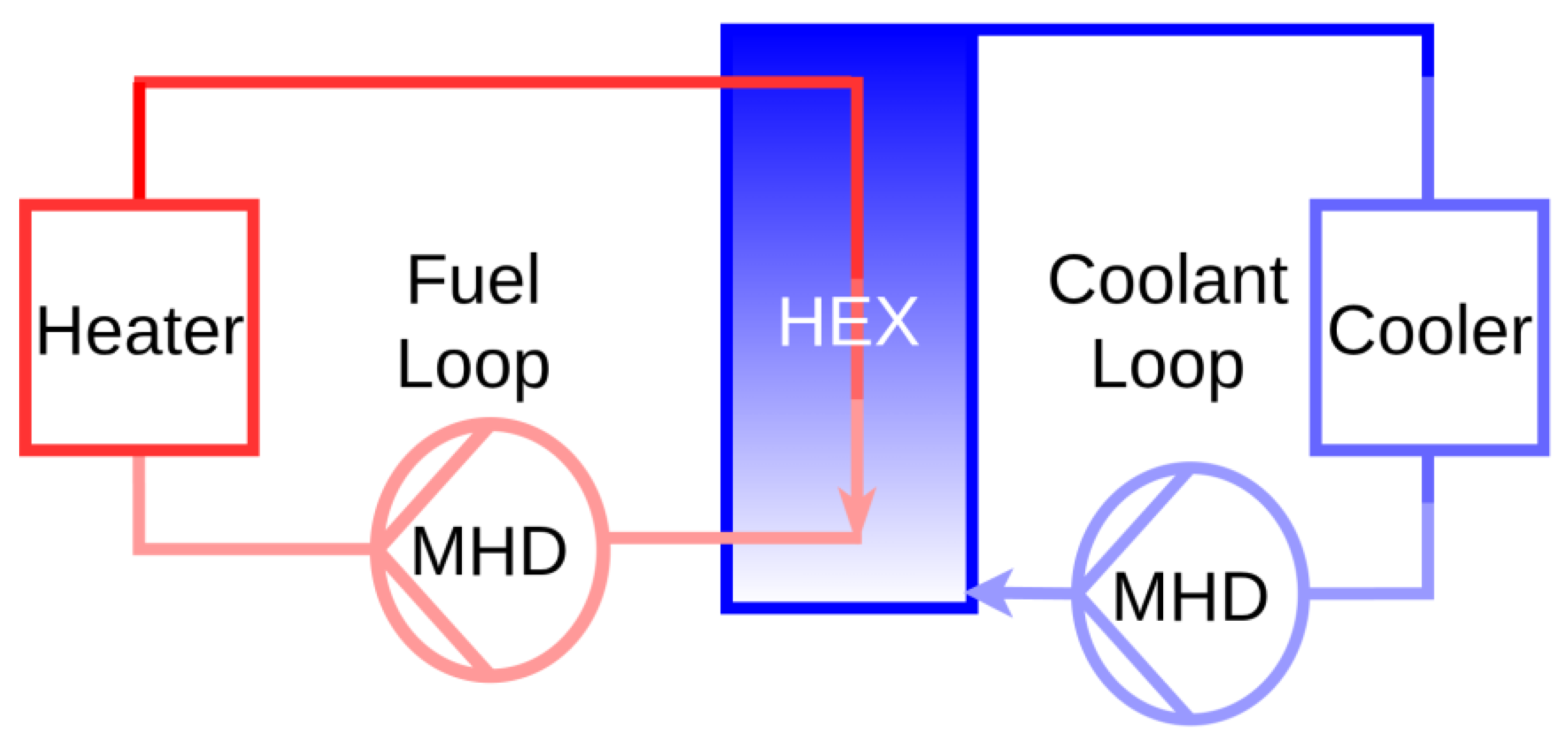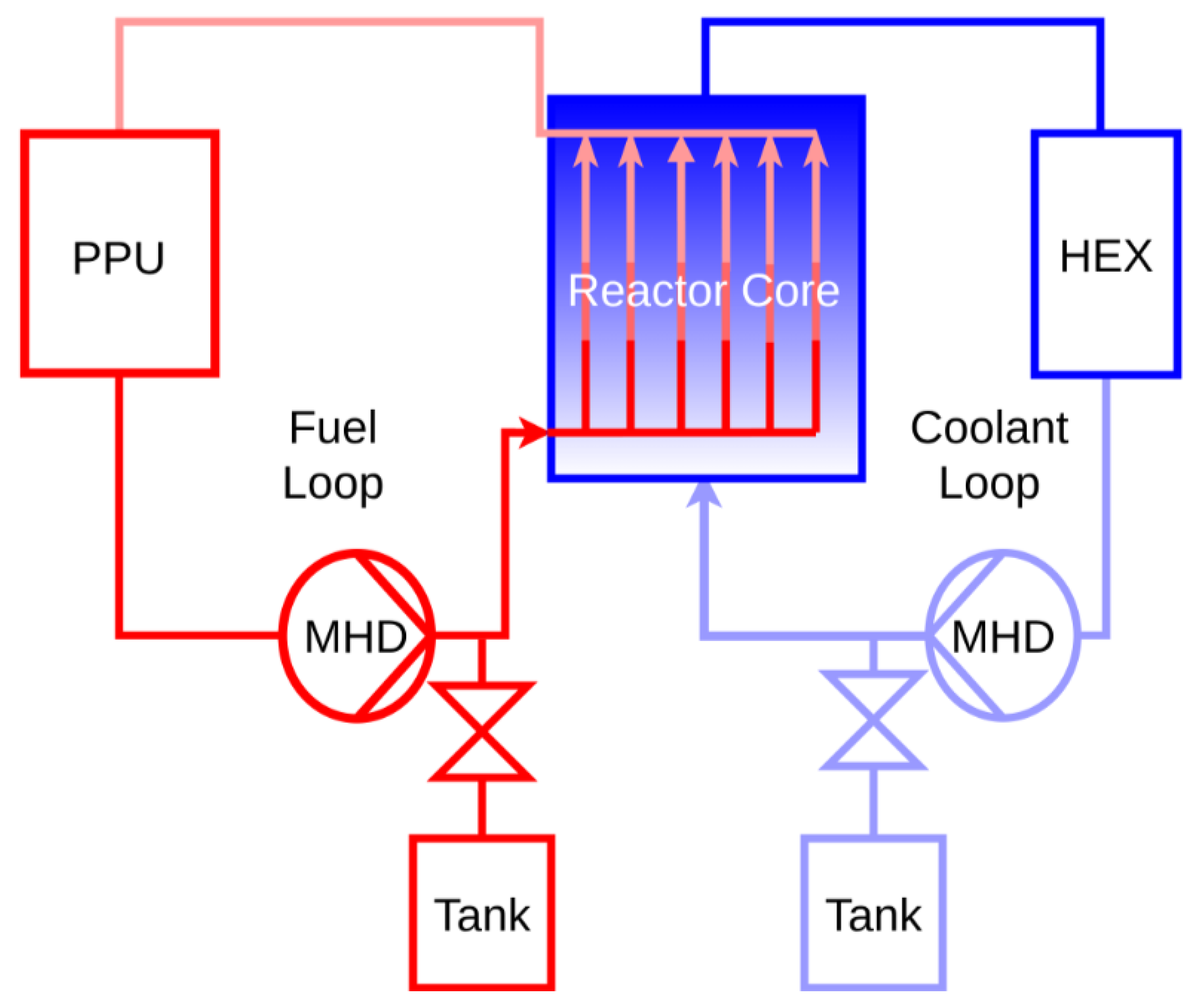 11]. The first circuit, the Fuel Loop, circulates the liquid fuel through the reactor core, where fission takes place. This loop also contains a Pyroprocessing Unit (PPU) for continuous, online removal of fission products and an MHD (magnetohydrodynamic) pump to maintain circulation. The second circuit, the Coolant Loop, pumps liquid lead through the reactor core to absorb the intense heat generated in the Fuel Loop. This heat is then transported via another MHD pump to a heat exchanger (HEX), where it is transferred to a conventional power conversion system to generate electricity [