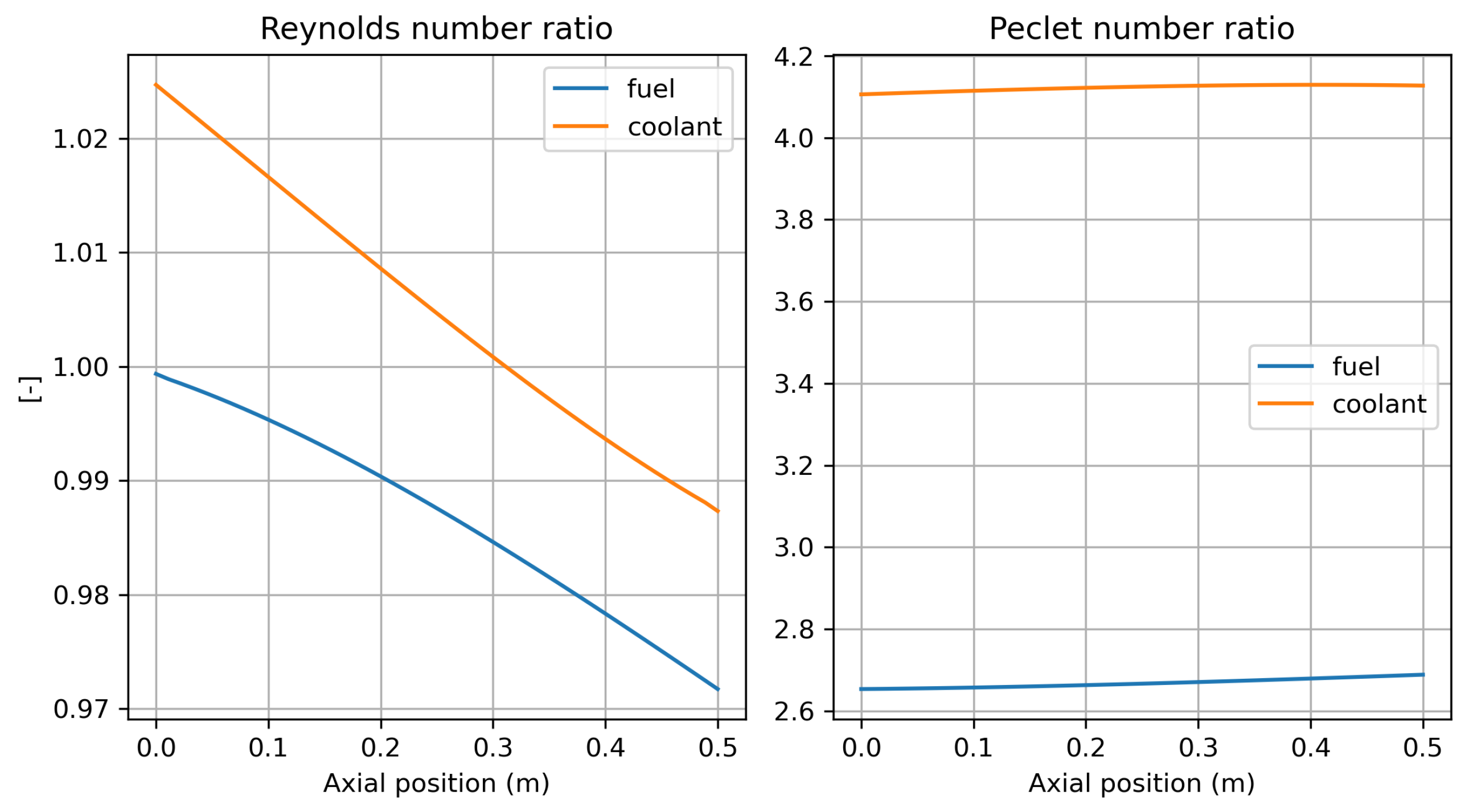 Figure 6. In this figure, on the left, one can observe a comparison of Reynolds numbers ratios for fuel and coolant between micro- and minidemonstrators defined as