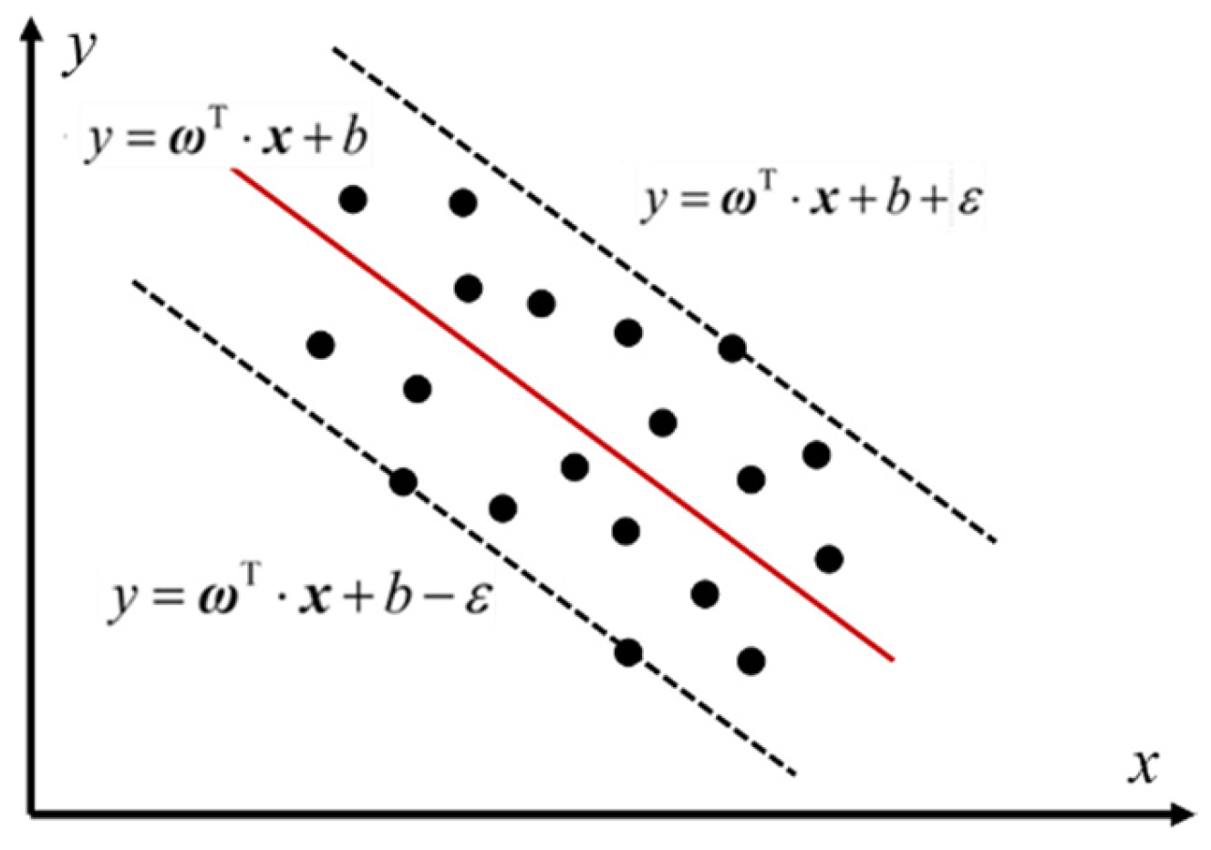 As shown in Figure 1, let the sample set be defined as (xi, yi), where i = 1, 2, …, N, with xi ∈ RN and yi ∈ R. SVR characterizes the multidimensional nonlinear relationship between the input vector x and the output y through a hyperplane, expressed as f(x) = ωx + b, where ω ∈ RN and b ∈ R. The hyperplane f(x) must satisfy the insensitive loss constraint: