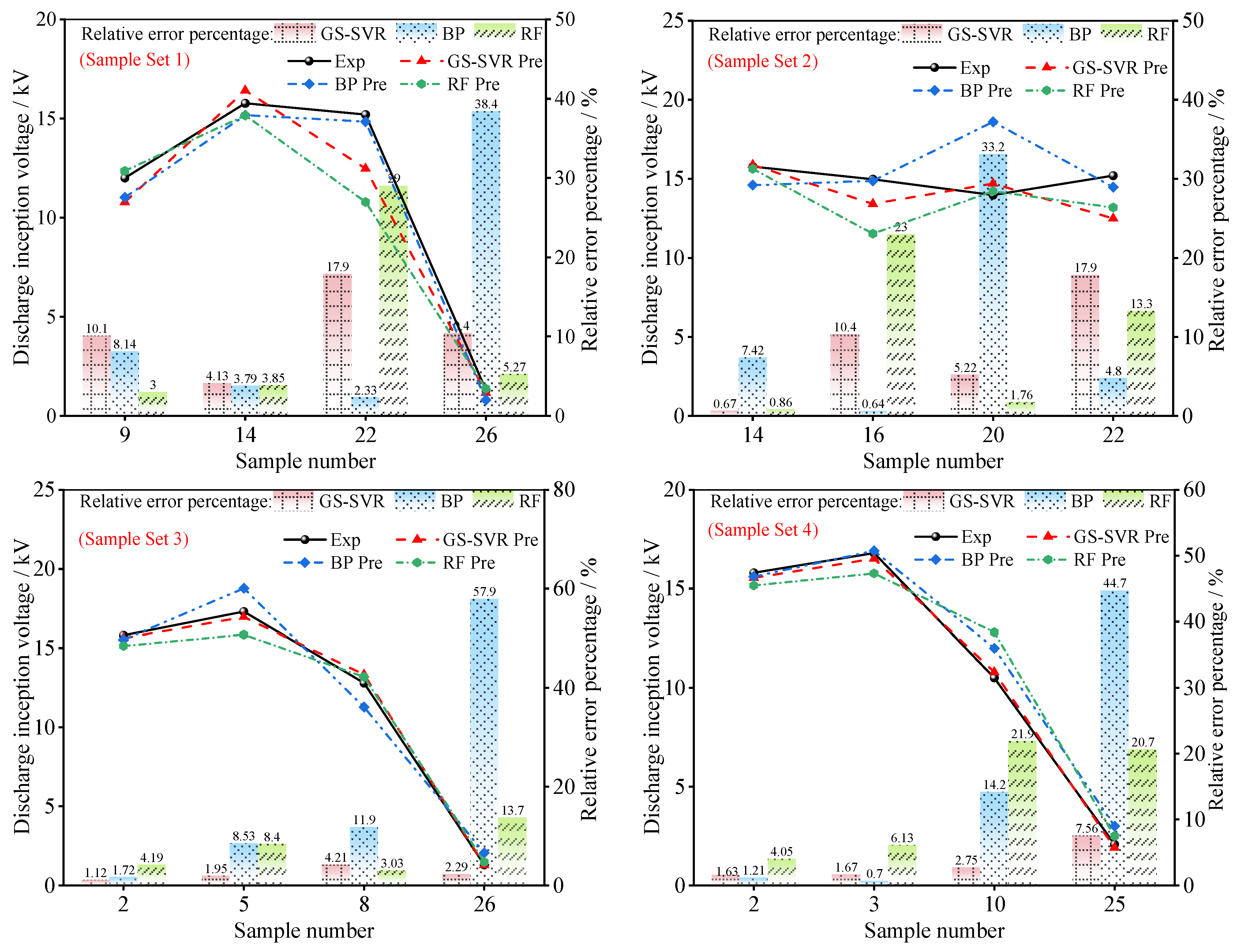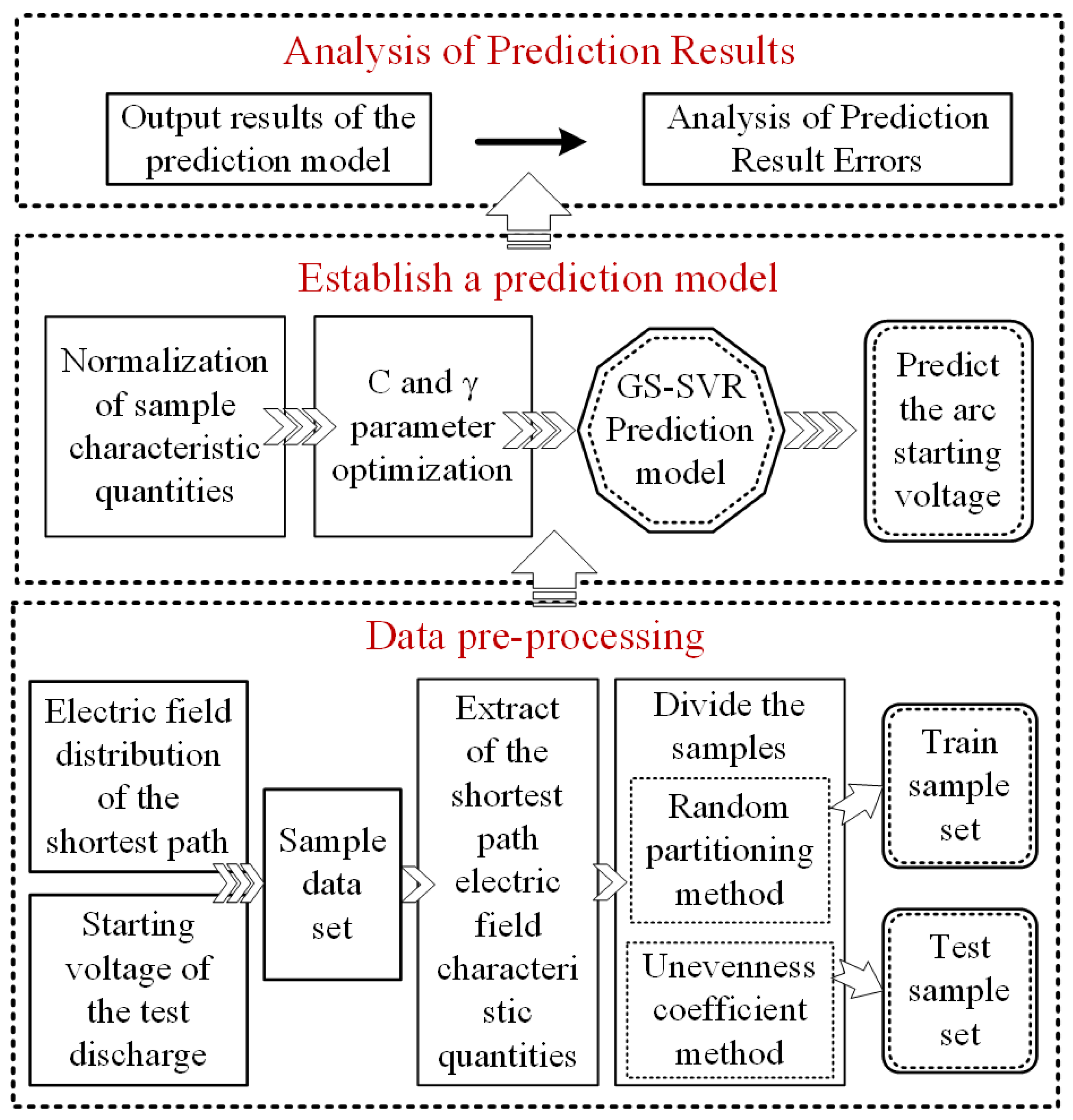 In summary, although certain achievements have been made in recent years in the modeling of surface discharge of insulating materials, researchers rarely address flashover voltage prediction under complex environmental conditions. Moreover, data-driven methods generally require large sample sizes, obtaining raw experimental discharge data remains challenging, and sample availability is limited—issues that have not been thoroughly investigated. There is currently a lack of predictive models for the arc inception voltage of insulating materials that can be effectively applied in practical engineering. To address these limitations, in this study, we focus on epoxy resin materials and propose a surface arc inception voltage prediction model based on support vector regression (SVR) optimized with grid search (GS). An optimized sample partitioning method using the electric field non-uniformity coefficient is introduced to enhance model performance.