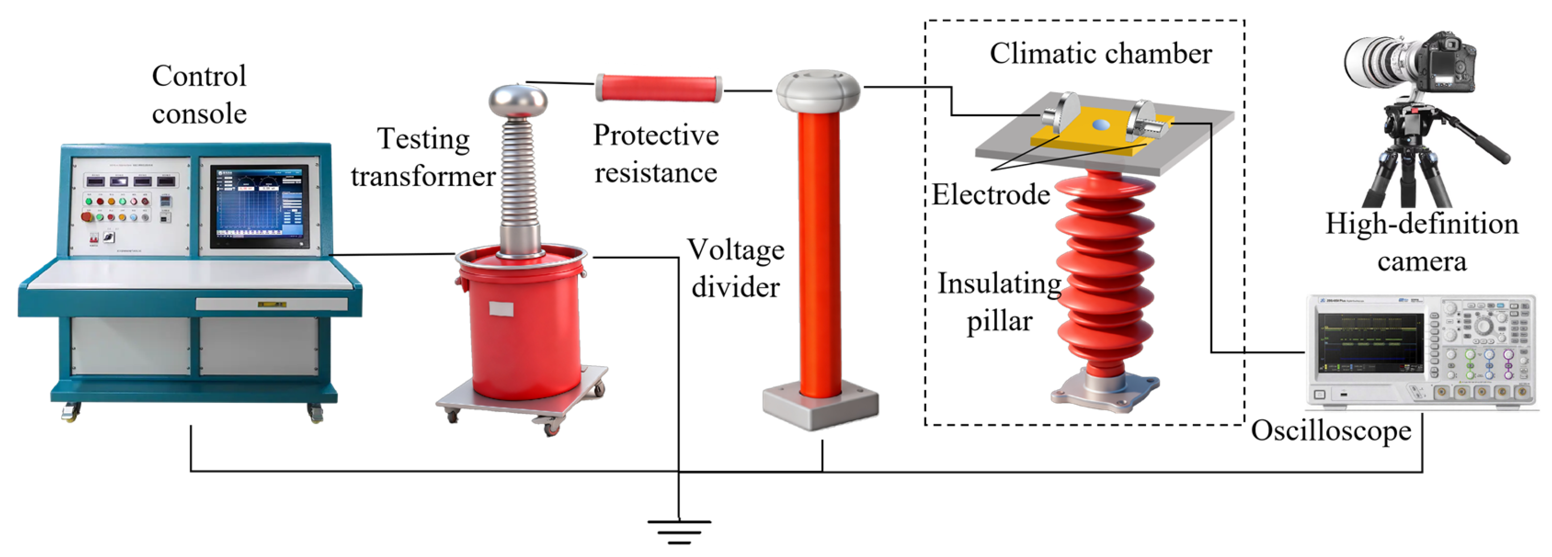 Surface flashover caused by creeping discharge is a major form of insulation failure on the surface of electrical equipment [7,8]. In environments with high humidity and heavy contamination, such as rain, fog, dew, and haze, a wet polluted layer forms on the surface of insulation materials after moisture absorption, significantly reducing the insulation margin of electrical equipment. Flashover may even occur under operating voltage, seriously threatening the reliable operation of the power system [9,10,11,12]. Research on predictive models for the surface arc inception voltage of insulating materials in complex environments is therefore of great significance for the operational stability of power systems.