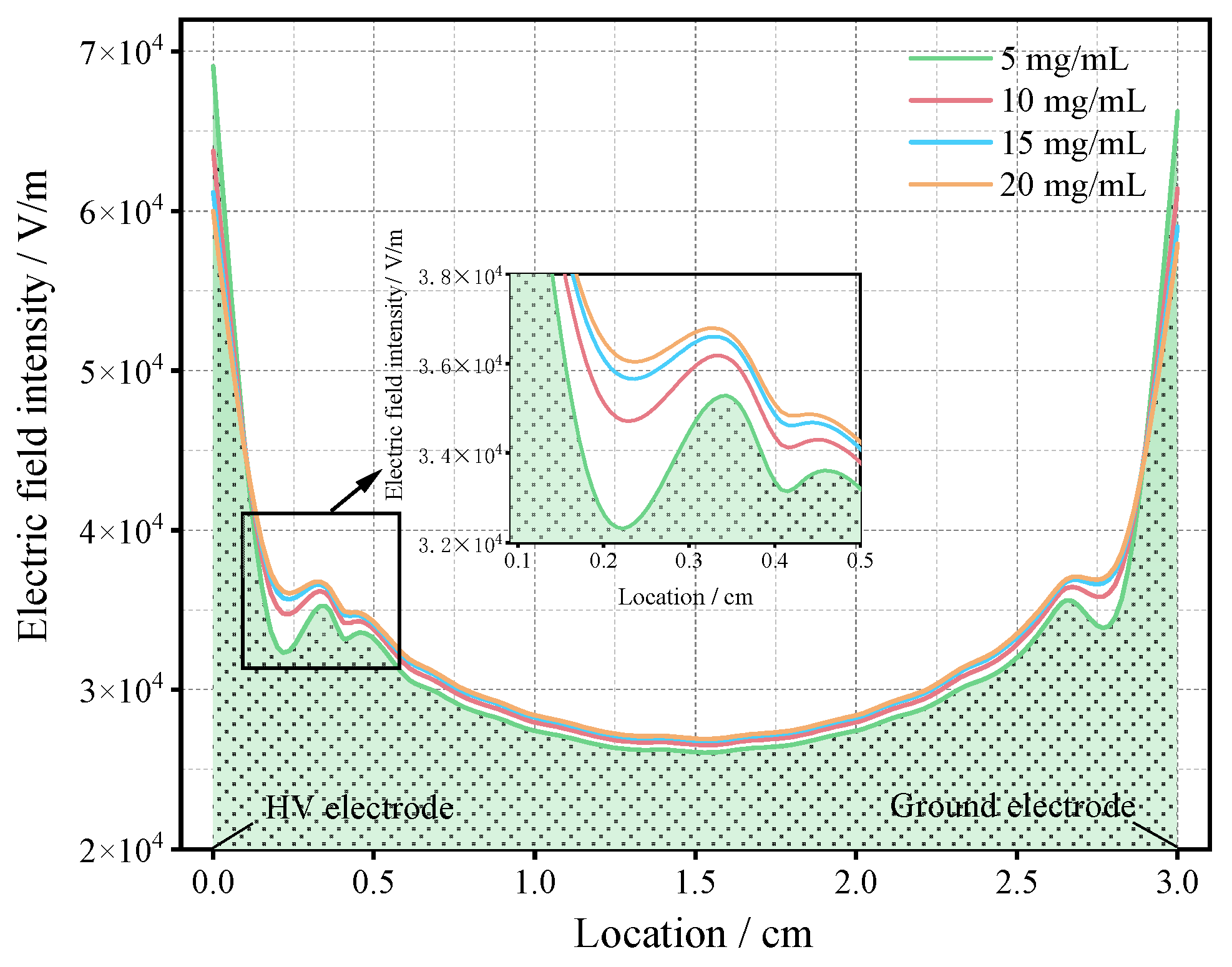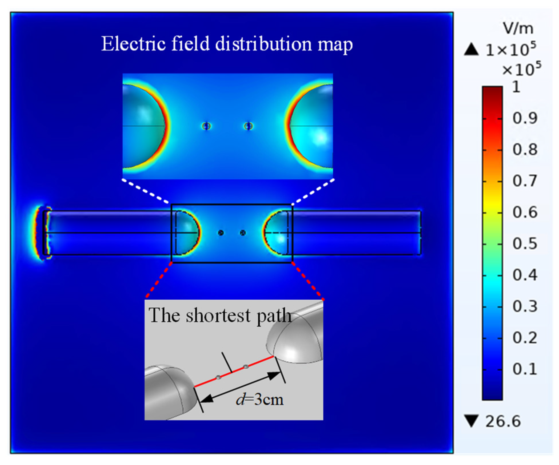 Path length mainly includes the path length in the region where the field strength exceeds 75% of Emax L75%, the path length in the region where the field strength exceeds 90% of Emax L90%, the path from the high-voltage electrode to the point of minimum electric field intensity Lh, and the full width at half maximum Lf. In this context, the half-peak full width Lf refers to the width of the peak at 50% of the maximum electric field intensity. The formula for its calculation is as follows: