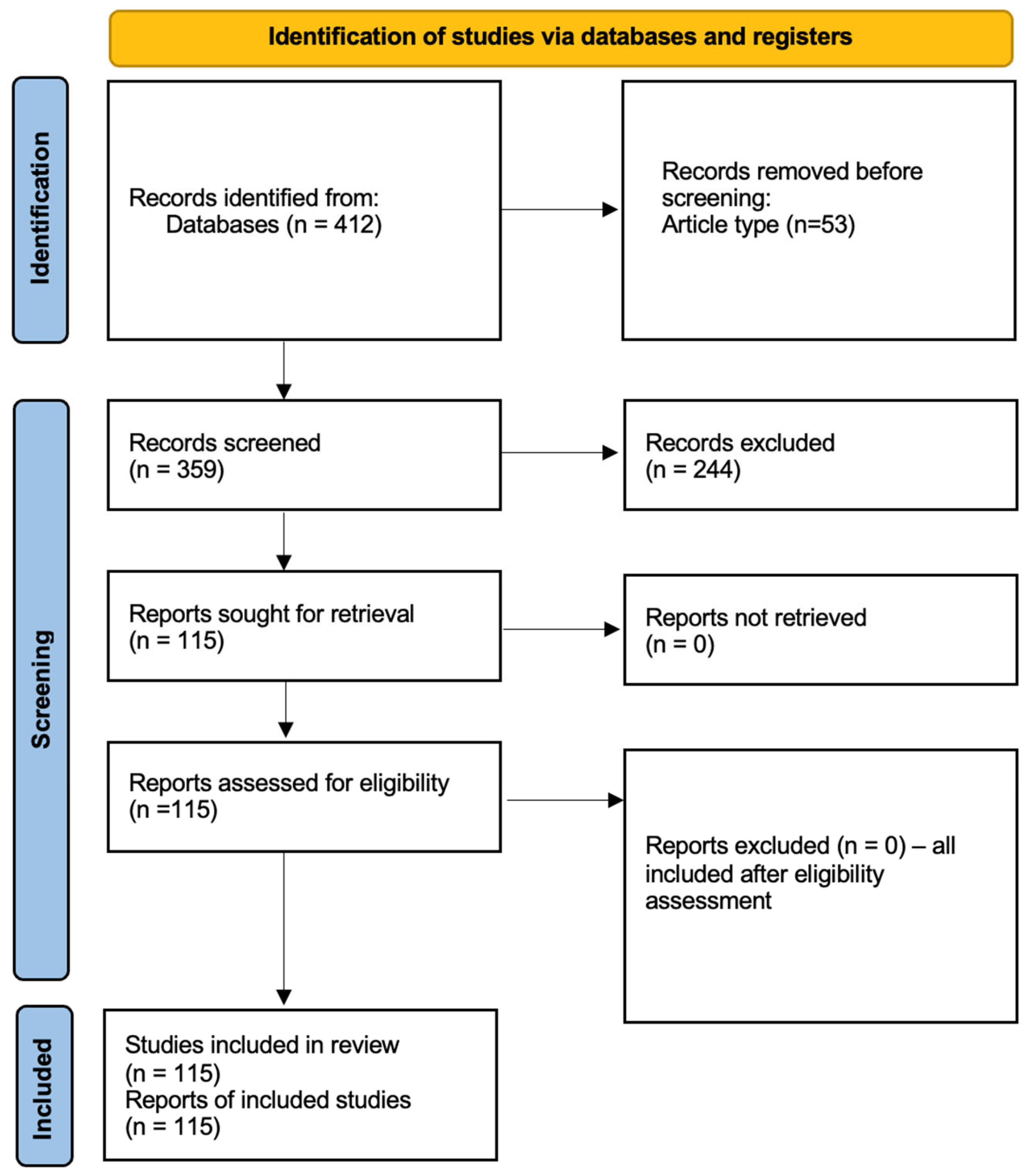 Figure 1. PRISMA 2020 flow diagram illustrating the screening and selection process of the 115 open-access articles included in this review.