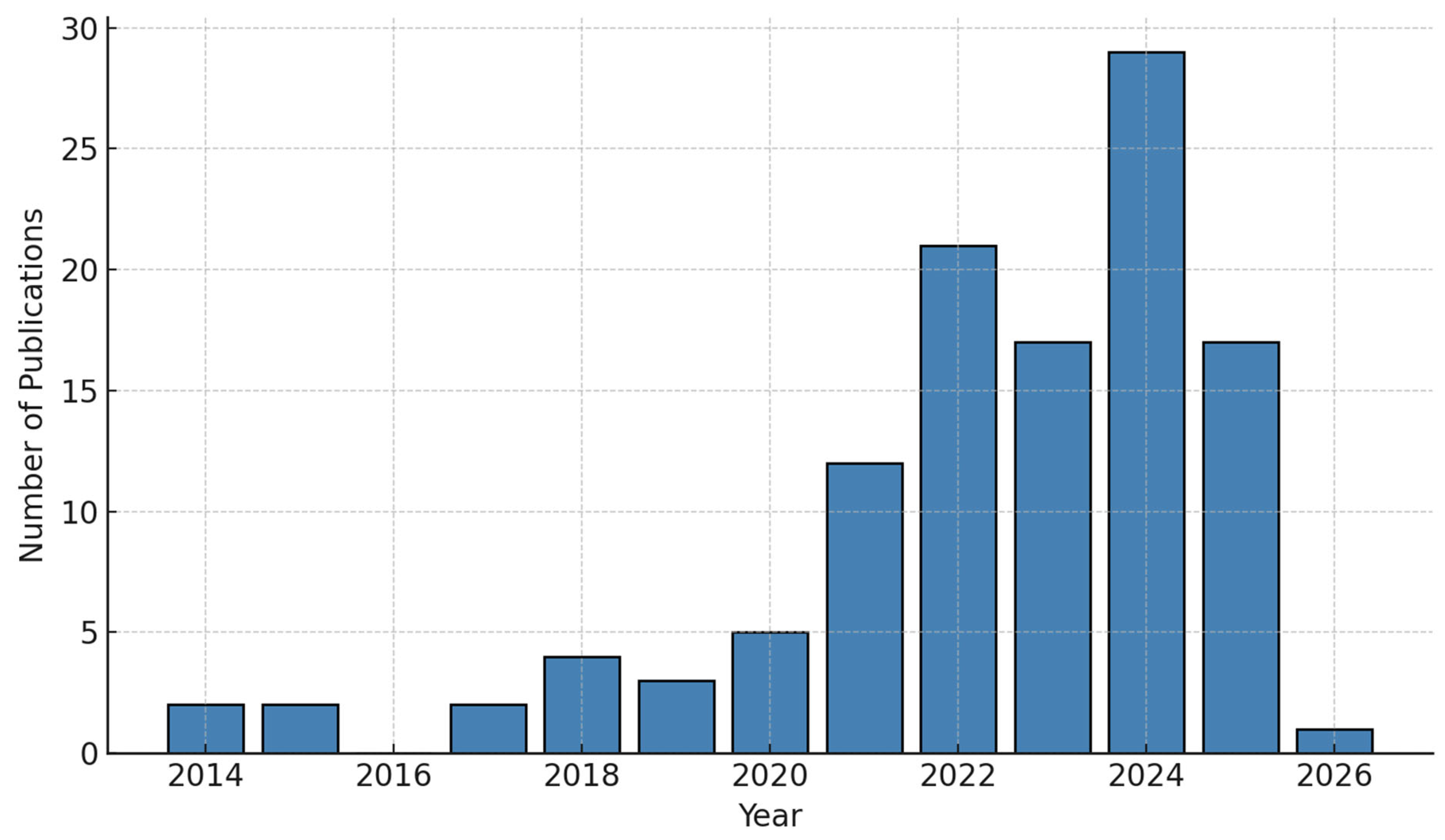 Figure 2. Annual publications on artificial intelligence in floating offshore wind turbines (2014–2026).