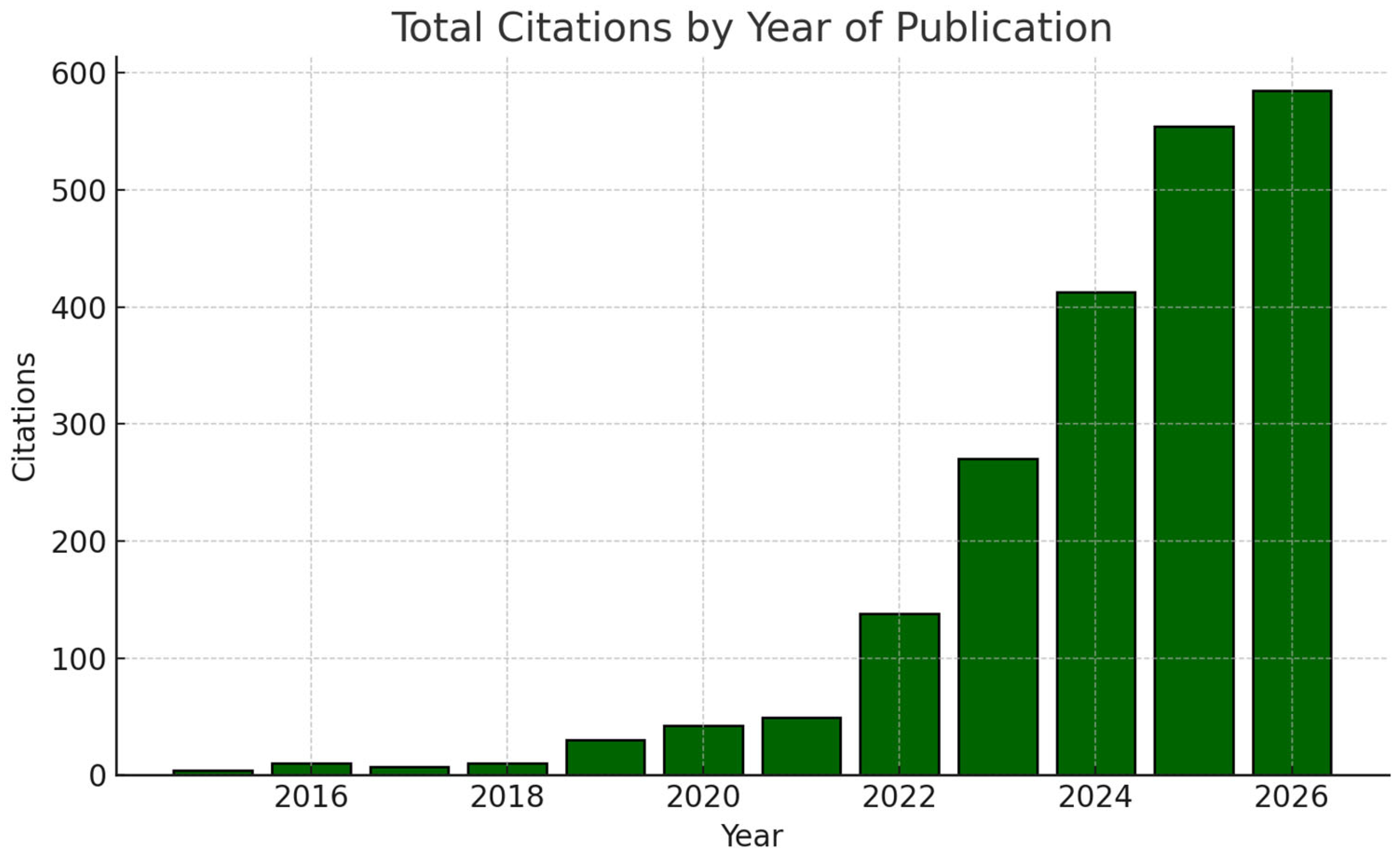 Figure 3. Total citations by year of publication for the reviewed corpus (2015–2025).