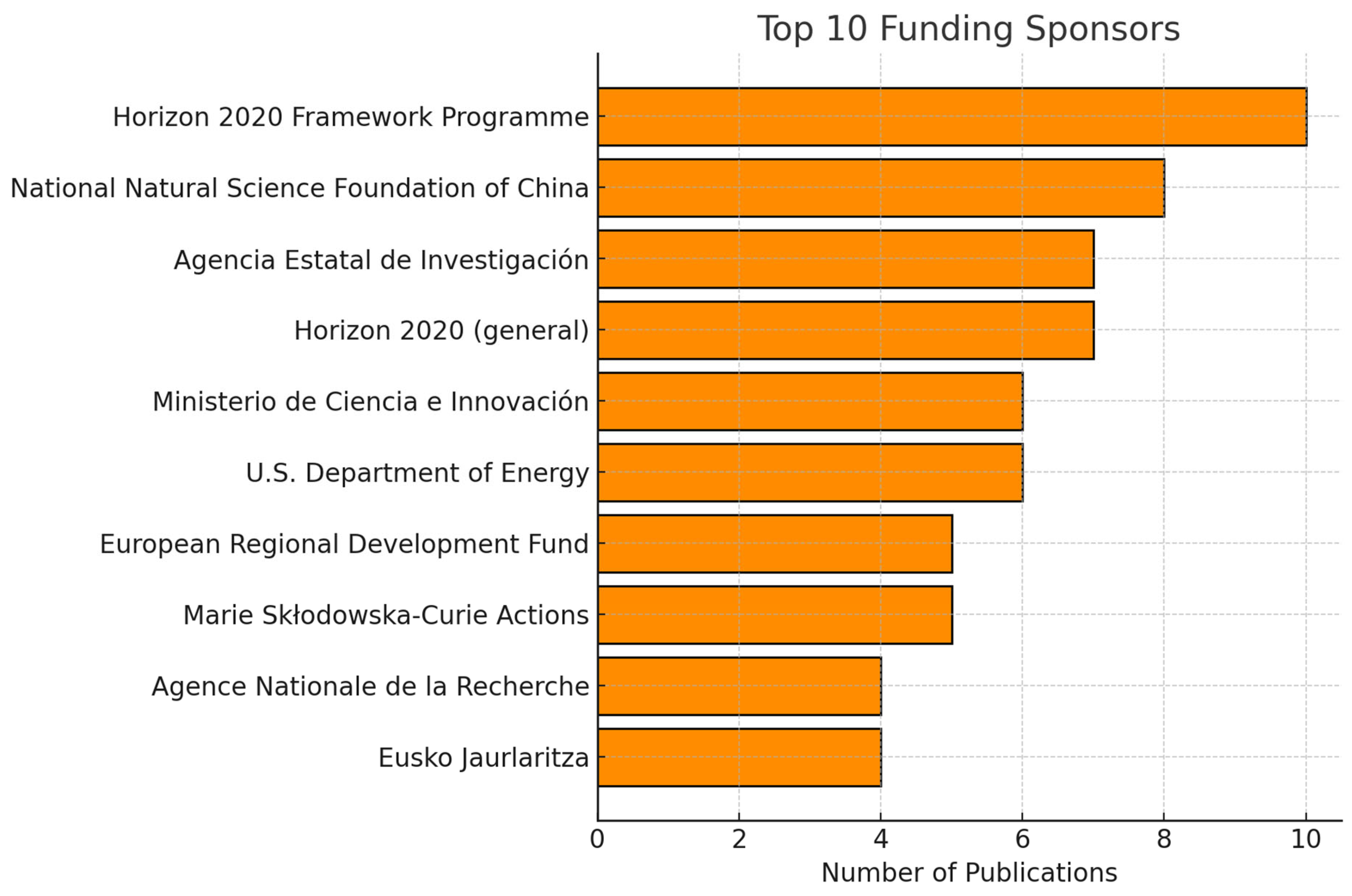 Funding analysis reveals the strong influence of public research programs. The EU Horizon 2020 Framework Programme supported at least 10 studies, complemented by Marie Skłodowska-Curie Actions (5) and the European Regional Development Fund (5). National agencies are equally prominent: the National Natural Science Foundation of China (8), the Spanish Agencia Estatal de Investigación (7), the U.S. Department of Energy (6), and the Norwegian Research Council (3). Sector-specific sponsors include Equinor, DNV, and the UK SuperGen Marine Energy Research Centre, which appear in targeted collaborations. This funding pattern shows that AI in floating wind is not a fringe activity but embedded within major strategic energy programs (Figure 6).