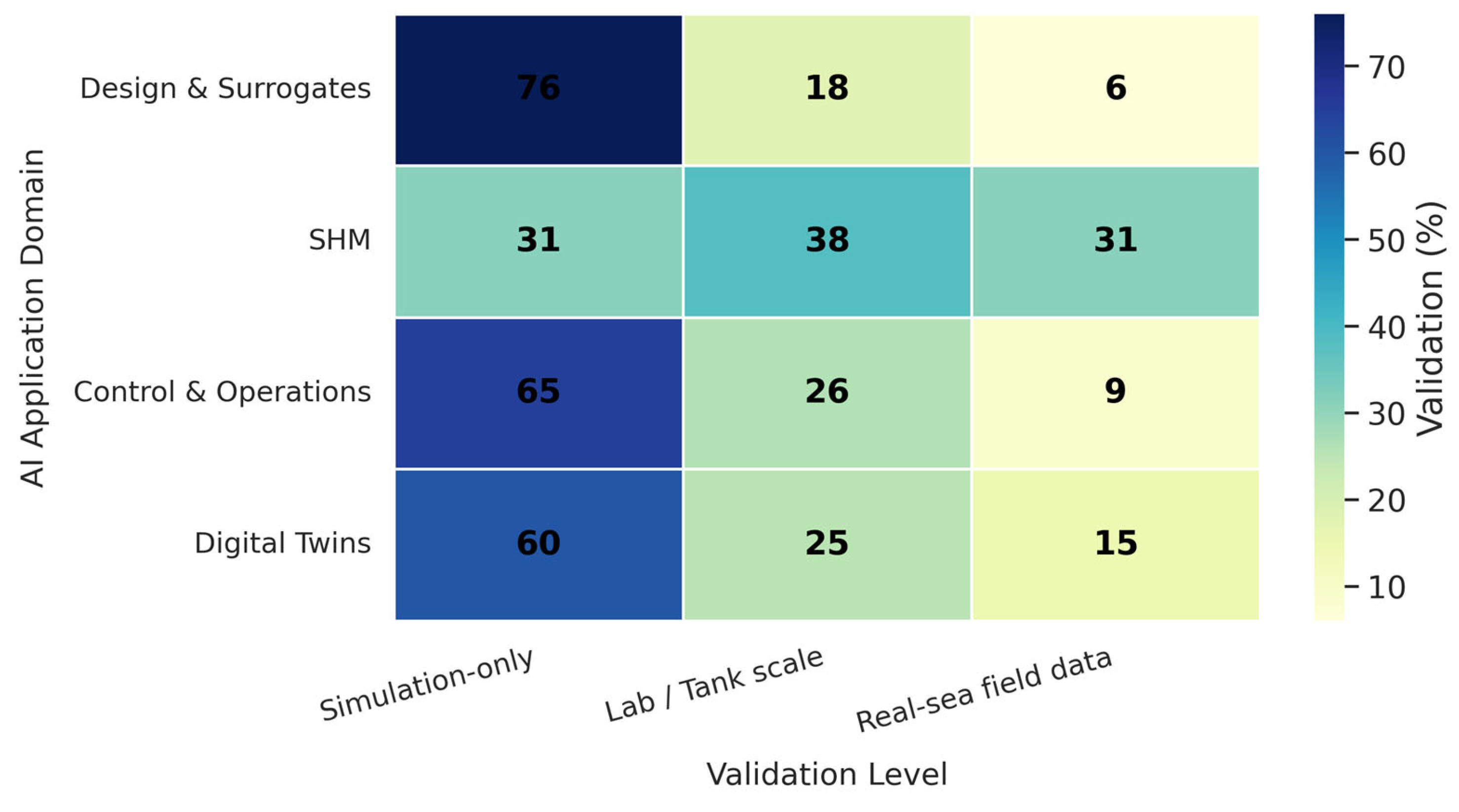 Overall, the bibliometric landscape underscores that AI for FOWTs is a fast-emerging interdisciplinary domain. It is led by a small group of European and Asian institutions, supported by international funding, and marked by rapid acceleration since 2020. The field remains concentrated in design surrogates, monitoring, and control, with digital twins gaining traction since 2023. Industrial participation is growing, but the majority of contributions remain academic, raising questions about technology transfer and deployment readiness.