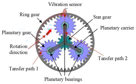 - Planetary gears: The force analysis of the planetary gears can be stated as follows: The primary forces involve the meshing forces between the planetary gears, the sun gear, and the ring gear, as well as the supporting forces of the planetary bearings. The dynamic equation of the planetary gears in the normal state can be shown in Equation (26) [].