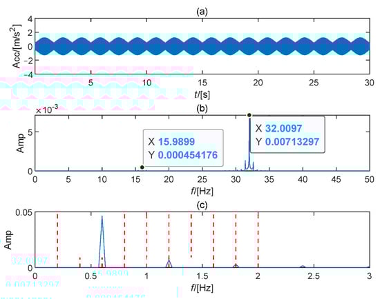 Results of nondriven-end generator bearing looseness []: (a) Time waveform; (b) Frequency spectrum; (c) Envelope spectrum.