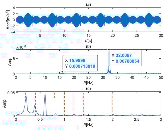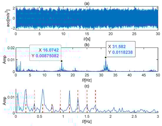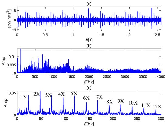 On-site signal analysis: (a) Time waveform; (b) Frequency spectrum; (c) Envelope spectrum.