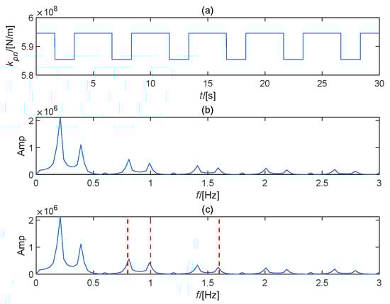 The proposed joint dynamic model is compiled using MATLAB 2023b with the ode15s solver. The simulation step size is 1/5120. The specific parameters are summarized in Appendix A. The simulated vibration signal in the x direction of the ring gear is utilized for analysis. Firstly, Figure 5a shows the simulated acceleration signal in the normal state without periodic impulses. Figure 5b states the meshing frequency of the planetary gear train and its harmonics (red dashed lines) in the frequency domain. In Figure 5c, the primary frequency is the triple rotating frequency, which is the characteristic frequency of the transmission path effect, and the fault frequency and its harmonics are not present in the envelope spectrum. Then, the planetary bearing outer ring looseness fault is simulated with ten percent degree growth. The definition of fault degree is the eccentric distance of the planetary bearing. The distance from no eccentricity to the furthest eccentricity is divided into ten equal parts, and the acceleration signal for each node is simulated for vibration analysis. In this study, the extreme eccentric distance is set to 10 mm. Then, the simulation node is situated at the eccentric distance of 0, 1, …, 9 mm, with the corresponding fault degree of 0%, 10%, …, 90%. Figure 6a depicts the simulated acceleration signal at the 40% fault degree, and the periodic amplitudes are enhanced in the time-domain waveform. In the frequency domain, the meshing frequency and its harmonics also behave consistently with the main components in Figure 6b. However, several modulation components arise around the meshing frequency. Figure 6c shows the fault frequency and its high-order harmonics (red dashed lines) emerge in the envelope spectrum. This phenomenon is consistent with the fault mechanism. After that, Figure 7a states the corresponding supporting stiffness of the planetary gear. The supporting stiffness is deduced with the fault period in the measured area that the failure planetary gear passes through the ring gear. Figure 7b,c show the main components are the fault characteristic and its harmonics (red dashed lines) in frequency and envelope spectrum. The fundamental reason is that the outer ring looseness fault of the planetary bearing causes the supporting stiffness to diminish as the planetary gear rotates. As a result, the vibration amplitude will increase during this period.