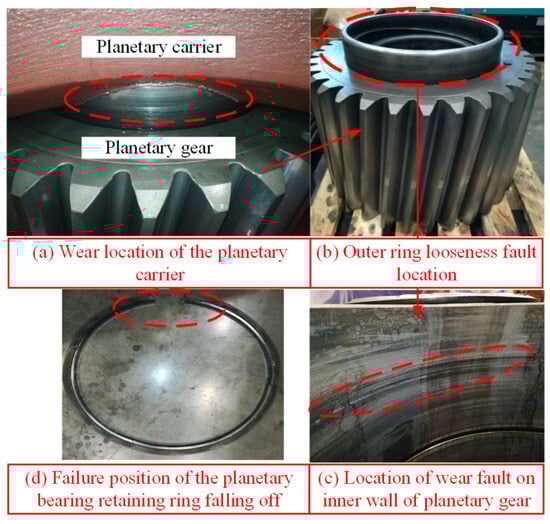 The aforementioned results serve to further validate the efficacy of the model. However, the accurate representation of fault frequency remains challenging, as the current modeling approach does not account for certain physiological effects inherent to the planetary stage (particularly those arising under low-speed operating conditions and the influence of complex transmission paths within the gear arrangement). Integrating the fault mechanism and signal simulation results, the on-site signal is further utilized to illustrate the correctness of the conclusion. The vibration acceleration data is sourced from a 2.2 MW double-fed wind turbine in a certain wind farm, and its measuring points are obtained from the surface of the internal ring gear. The specific structural parameters are concluded in Appendix A. Following the identification of a loosening fault in the wind turbine’s planetary bearing, a structural teardown was performed to diagnose the root cause. Figure 13 shows the disassembled diagram of the fault location. The primary reason for the looseness fault of the planetary bearing is that the retaining ring of the outer ring slips off. Figure 13a,b state the looseness fault location. Figure 13c depicts the wear fault location on the inner wall of the planetary gear. Figure 13d shows the falling retainer ring. Figure 14a states the measured acceleration signal in the ring gear. The periodic components are not prominent in the time domain. Figure 14b,c depict the corresponding frequency spectrum and envelope spectrum, respectively. In the frequency domain, the primary components are the meshing frequency of the planetary gear train and its harmonic with the modulation in fault frequency. The fault frequency and its harmonics (red dashed lines) are conspicuous in the envelope spectrum. It is worth noting that the characteristic frequency of the transmission path effect (triple rotating frequency) is also superimposed on the frequency, which is consistent with the fault mechanism and simulation results.