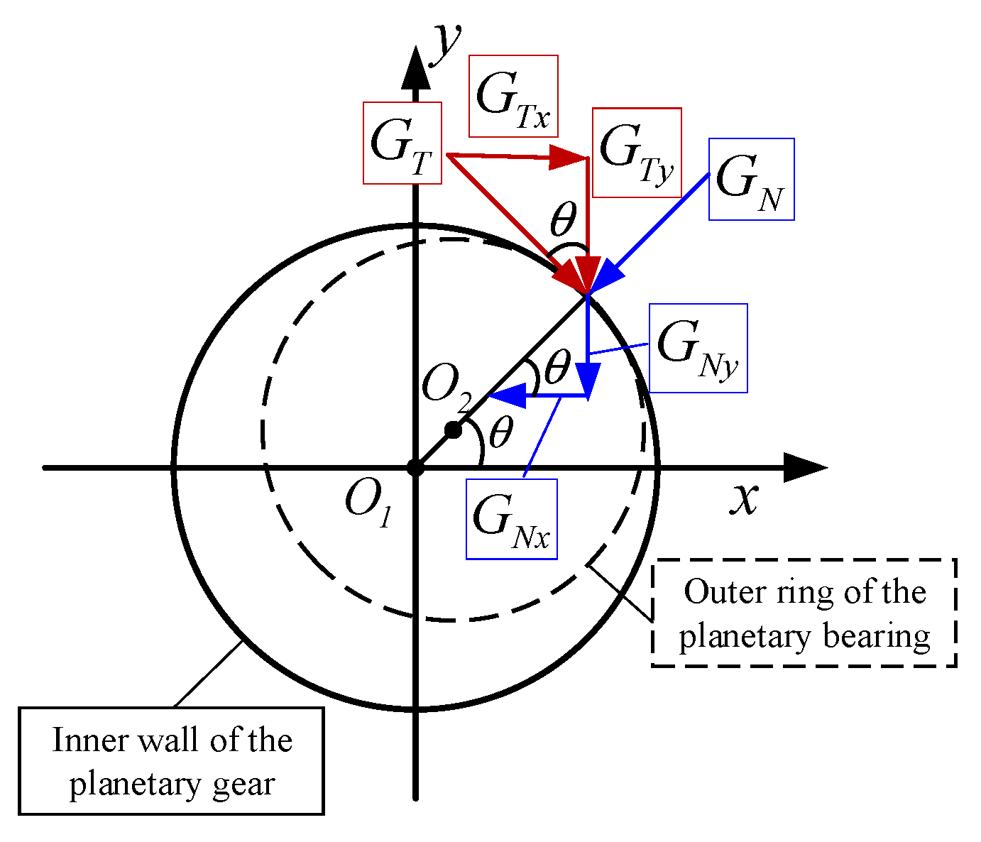 There will be relative sliding between the outer ring and the inner wall of the planetary gear when the outer ring looseness fault arises [29,30]. Figure 1 shows the stress state between the OR and the IWPG. The planetary bearing will be eccentric when the looseness fault arises. In Figure 1, O1 and O2 are the center of the planetary gear and the outer ring of the planetary bearing, respectively. Generally, O1 and O2 are coincident in the normal state. GN is the normal impact force, and GT is the tangential friction force. GNx, GNy, GTx, and GTy are component forces of GN and GT in the x and y directions, respectively. θ is the included angle between GN and the x-axis.