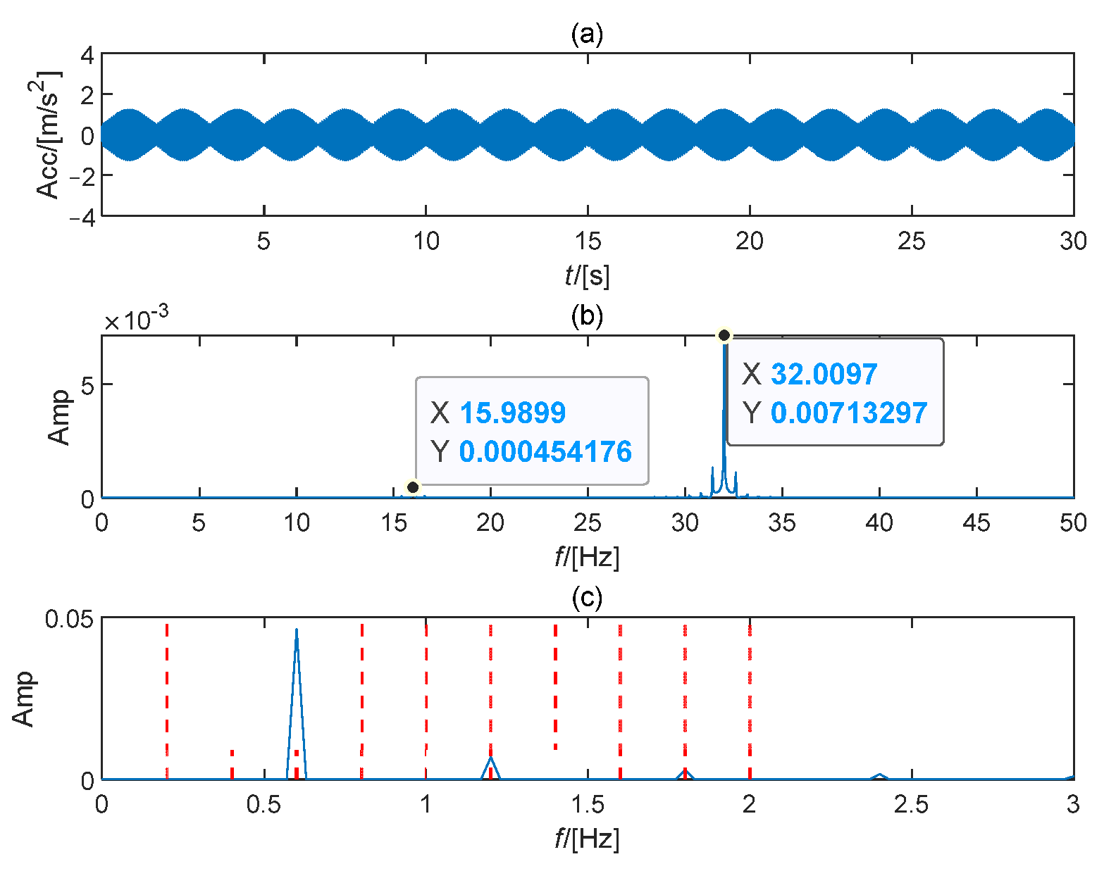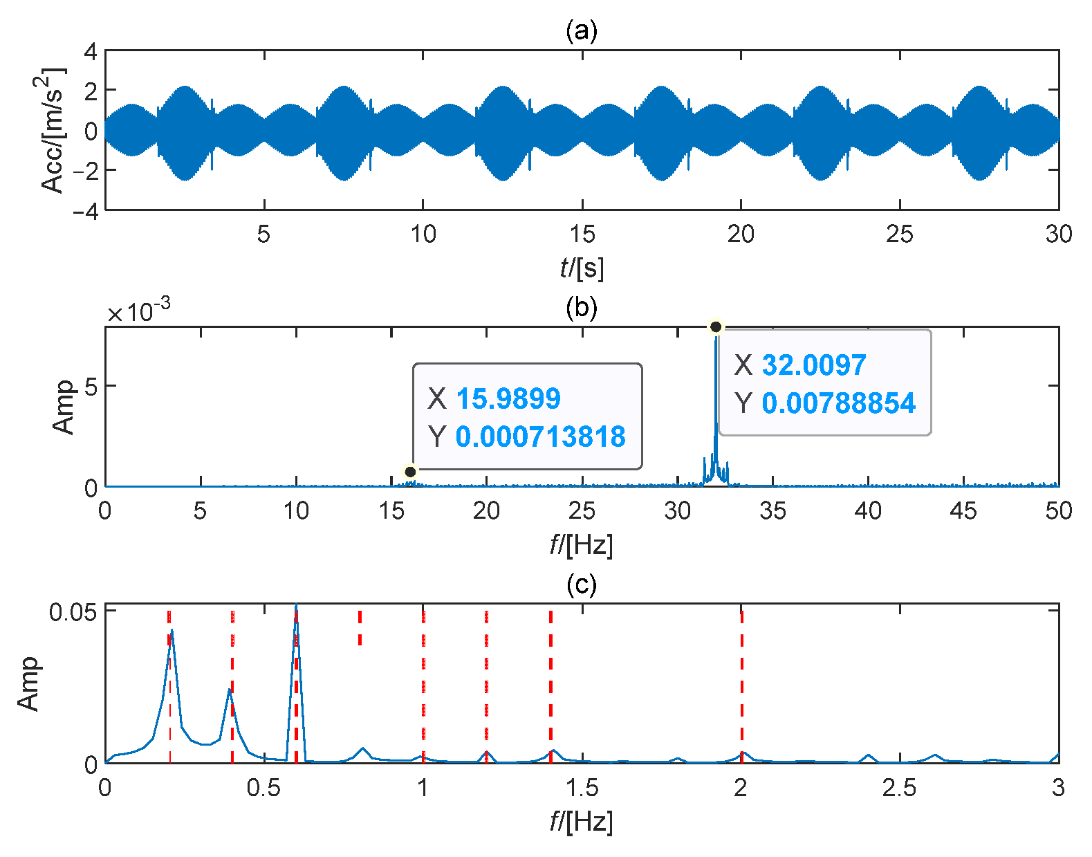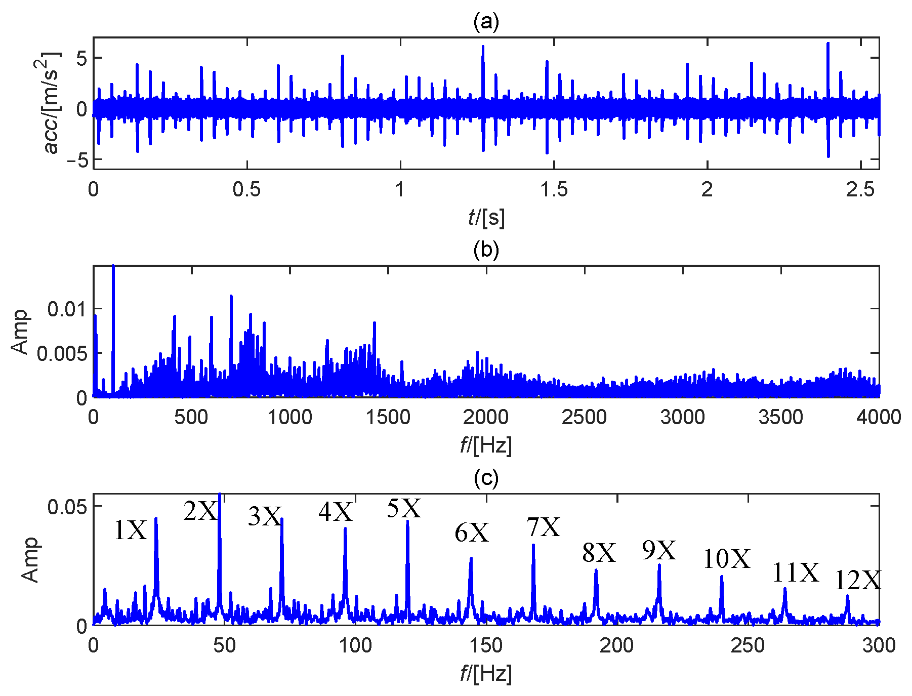 Figure 14. On-site signal analysis: (a) Time waveform; (b) Frequency spectrum; (c) Envelope spectrum.