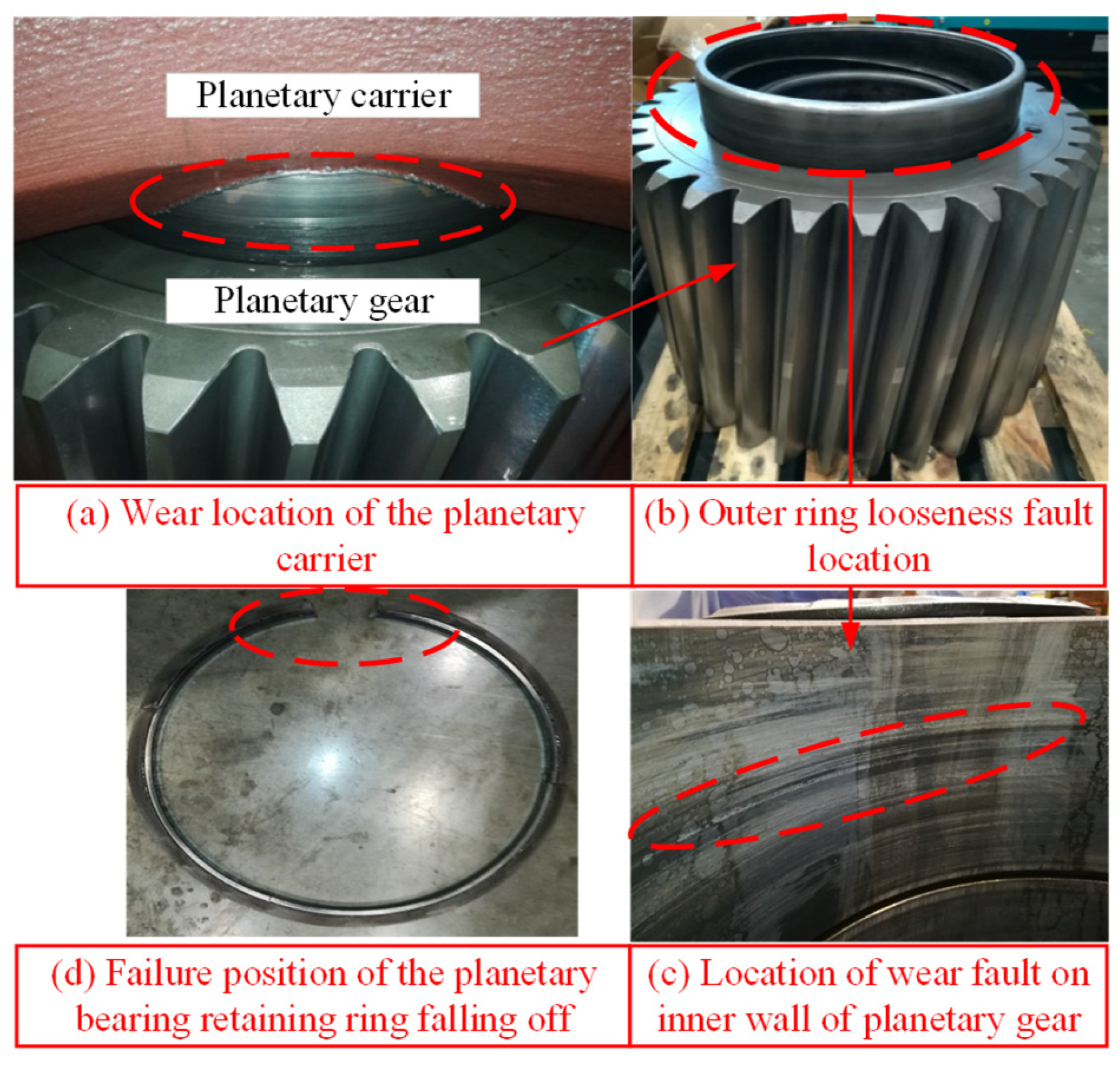 There are two primary challenges in accurately simulating loosening faults in wind turbine planetary stages: (1) When loosening fault occurs, it is challenging to directly establish the coupling models of the planetary gears and their bearings, sun gears, and internal ring gear in the planetary gearbox of wind turbines; (2) The coupling relationship between planetary gears and bearings is complex [19,20,21]. Acceleration sensors are often placed on the surface of gearboxes, and transmission paths between components invariably have an impact on the monitoring signals [22,23,24]. Another major challenge is analyzing and measuring the vibration components of the primary transmission paths.