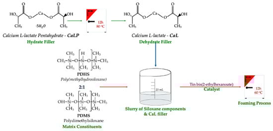 The synthesis of a composite foam structure with varying CaL contents was carried out according to the procedure reported by Calabrese et al. [] (see synthesis scheme reported in Figure 1). In summary, the polymers poly(methylhydrosiloxane) (PMHS) and silanol-terminated polydimethylsiloxane (PDMS) (both supplied by Gelest Inc., Morrisville, PA, USA) were used in a 2:1 ratio (PMHS–PDMS) and slowly mixed with pure ethanol (Sigma-Aldrich, St. Louis, MO, USA). Different amounts of CaL dehydrate were slowly added to the mixture of the polymers. The anhydrous form of the calcium L-lactate was obtained by drying the pentahydrate form (0–70 wt.%—Sigma Aldrich) of the salt overnight at 80 °C.