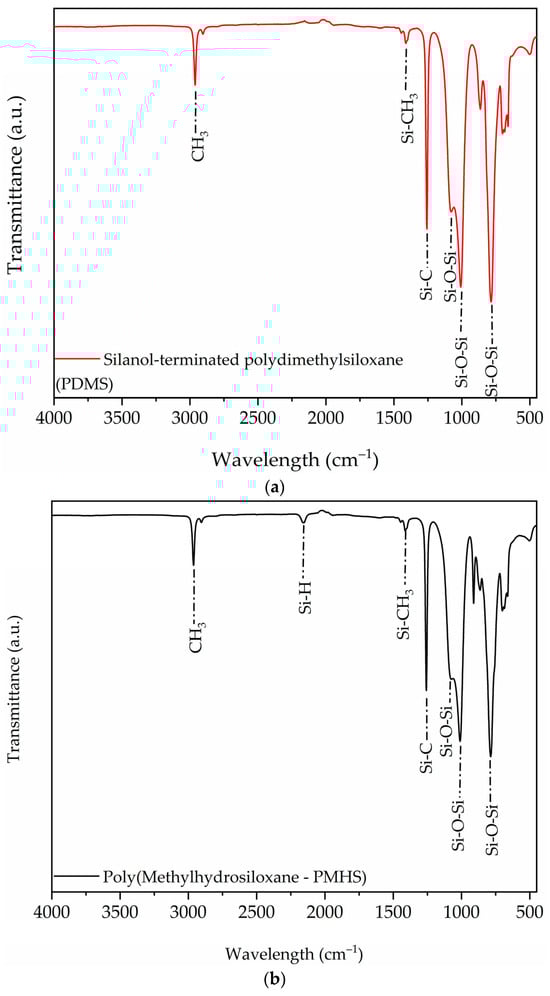 An Attenuated Total Reflectance Infrared Spectrophotometer (ATR-FTIR, Spectrum Two, PerkinElmer Inc., Waltham, MA, USA) was used for the chemical characterization of CaL, CaL-PDMS composite, and siloxane compounds. Prior to characterization, the samples were dehydrated in a dry air oven overnight at 80 °C (except for the siloxane polymers). A small amount of sample was placed on the diamond crystal base, and moderate pressure of approximately 60% was applied to the samples. FTIR spectra were recorded in a wavelength range of 4000–500 cm−1 using 16 scans. The instrument has a spectral resolution of 4 cm−1 for solid samples.