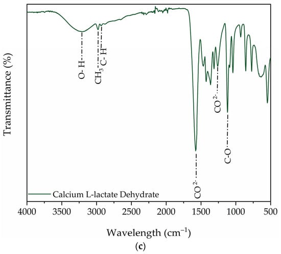 The dehydrated CaL FTIR spectra (Figure 2c) show the characteristic broad peak of O-H stretching vibrations with a maximum at 3131 cm−1. Furthermore, symmetric and asymmetric stretching at 2984 cm−1 and 2932 cm−1 in the CH3 and CH groups, respectively, can be identified []. Two intense peaks at 1567 cm−1 and 1394 cm−1 describe the symmetric and asymmetric vibrations of the carboxylic group (), and at 1118 cm−1, we can see the adsorption band of the stretching vibration in the C-O group [].