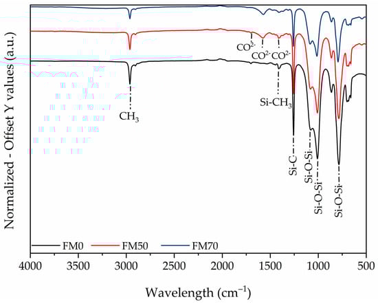 The chemical interactions within the dehydrated salt; the composite foam; and the FTIR spectra of the FM0, FM50, and FM70 composites are compared (see Figure 3). FM0 (black solid line) shows the characteristic absorption bands of both siloxane components at 2963 cm−1, 1410 cm−1, and 1258 cm−1 (the Si-CH3 groups) described above, as well as the vibrations in Si-O-Si at 1078 cm−1 and 1010 cm−1, without the characteristic band of the Si-H group at 2158 cm−1. In comparison, the spectrum of CaL-PDMS foam composites FM50 and FM70 (Figure 3) presents the same absorption bands observed in the matrix without filler (FM0). In addition, the presence of symmetric (1573 cm−1) and asymmetric (1415 cm−1) vibrations characteristic of the carboxylic group effectively indicates that CaL is present in the PDMS composite.