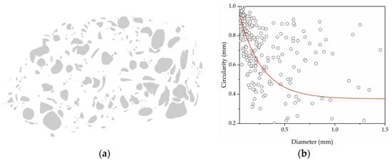 To gain a clearer understanding of how the filler content influences the morphology of the foams, an analysis of the bubble (void) distribution was performed using digital image analysis using the Inkscape (Version 1.2) (see Figure 5a,c,e). This approach enables a quantitative assessment of the size, shape, and spatial distribution of bubbles within the foam structure, providing valuable insights into how varying filler concentrations impact the internal architecture and overall uniformity of the material. The circularity evolution of the void circularity (mm) vs. diameter size (mm) distribution of the CaL-PDMS foams with different wt.% filler contents was analyzed (see Figure 5b,d,f). Circularity has been calculated directly using the ImageJ (Online version-ij.imjoy.io), where low values describe an irregular morphology, and values near one describe spherical morphologies [,].