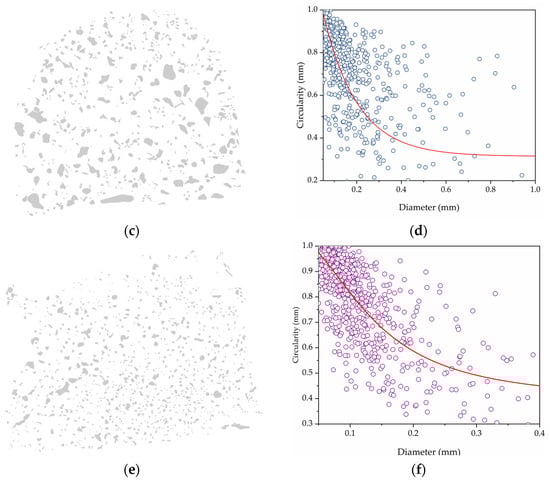 Comparison of void distribution in composite CaL-PDMS foams at different wt.% contents: (a) FM0, and (c) FM40, and (e) FM70. Analysis of the fitting (red line) in the evolution of circularity distribution: (b) FM0, (d) FM40, and (f) FM70.