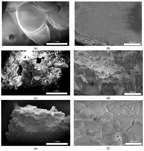 Comparison of SEM analysis of CaL-PDMS foams: (a,b) FM0 without filler; (c,d) composite FM50; (e,f) composite FM70.