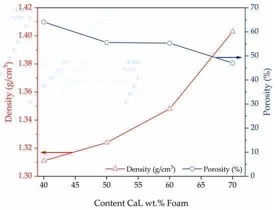 Figure 7 compares the evolution of the density of the composites and their porosity with the amount of CaL. The density of the composites increased progressively with the amount of calcium lactate (CaL) added to the polymer matrix, ranging from 0.132 g/cm3 for the unfilled sample (FM0) to 1.403 g/cm3 for the composite with the highest CaL content (FM70). In contrast, the porosity of the composites followed an inverse trend, decreasing (64.08% to 47.06%) as the CaL content increased.