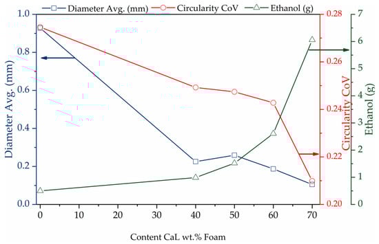 Evolution of statistical analysis of void distribution with different amounts of dehydrated salt within composite CaL-PDMS foams. Comparison of diameter average (mm), circularity CoV, and ethanol (g) quantity.