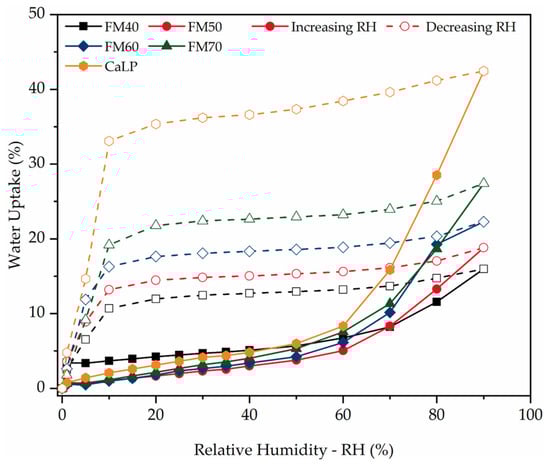 Cyclic reversible hydration–dehydration isotherm curves were obtained at 30 °C by varying the relative humidity of the chamber between 0% and 90% using a thermogravimetric dynamic vapor system to evaluate the thermochemical behavior of the CaL-PDMS foams. The FM0 sample (without filler), in this context, was observed to serve purely as a structural support, exhibiting no intrinsic capacity for water vapor adsorption []. The mass change, expressed as water uptake (%), was analyzed using the initial mass of the CaL-PDMS composite sample. For all samples, analysis of the adsorption branch of the isotherm curve (represented by the solid line in the plot; see Figure 9) revealed a relatively low mass change—less than 5%—at relative humidity (RH) levels between 0% and 50%. Although a slight increasing trend with increasing CaL content in the foam can be observed, the differences among the samples in this RH range are minimal and not statistically significant. This behavior reflects the inherently low hygroscopicity of the PDMS matrix and the limited water adsorption capacity of the composite structure under moderate humidity conditions. However, under high humidity conditions (for RH values > 60%), the water uptake increases substantially across all samples, with the magnitude of this increase strongly correlated to the amount of CaL incorporated into the composite, as the higher the CaL content, the higher the water uptake.