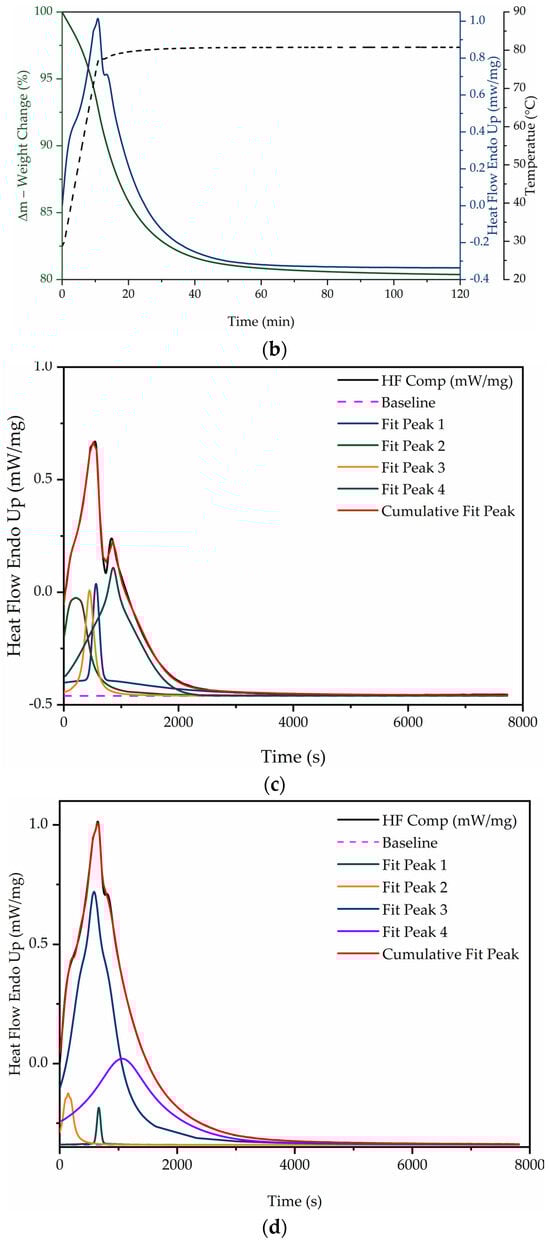 On the other hand, as observable in Figure 10c,d, the DSC heat flow profiles of the investigated samples (FM40 and FM70) showed three endothermic events, implying that heat absorption involves different phenomena. Consequently, deconvolution of the signal was performed using a pseudo-Voigt profile method, which combines Gaussian and Lorentzian curves (see Figure 10c,d and Figure S2 in the SI). A similar fit has been used in the literature to describe the absorption and desorption behaviors of other molecules []. For pure CaL, the presence of a maxima peak suggests that the desorption of water molecules adsorbed on the CaL surface occurs first, followed by those adsorbed within the bulk of the material [].