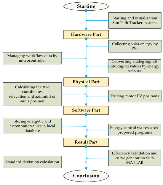 The research methodology is divided into several parts and subparts, as illustrated in a summarized flow diagram (Figure 1). Following the literature review, this research focuses on measuring and quantifying energy values generated by solar panels equipped with various sun-tracking systems (featuring four degrees of freedom), processing the data using a planned program uploaded to a microcontroller, and transmitting the measurements to a local database. Subsequently, the results are analyzed by calculating the energy efficiency of each system in comparison with a fixed panel, and the primary overall phases of the study are also presented in graphical form.