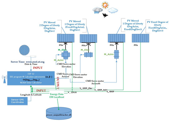 The microcontroller ESP32 MCU (Micro Controller Unit; Espressif Systems, Shanghai, China) used in this study plays an important role in the experiment by having a General-Purpose Input/Output (GPIO) pin and can be assigned to an internal or external peripheral signal. However, the MCU handles data workflow input and output, which are shown in Table 1, within the solar tracking system, managing several critical phases of data processing. Figure 2 illustrates the main components used to build the test prototypes by the authors.
