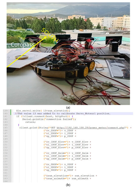 Calibration of PV orientations using Compass and Program: (a) Orientation of the robot’s position first toward the south to follow the sun from east to west; (b) In this case, the value 13 was added to readjust the initial position error of the SM1.