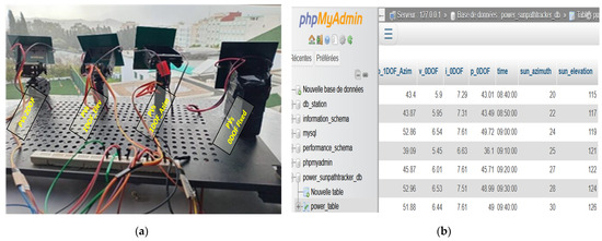 Some hardware and software tools: (a) Three SPT systems and fixed PVs; (b) Local database power_sunpathtracker_db.