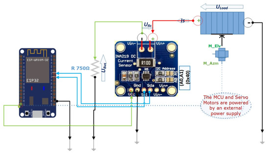 - Collecting photovoltaic energy data using INA 219 sensor (Texas Instruments, Dallas, TX, USA), which communicates with the MCU via the I2C bus.