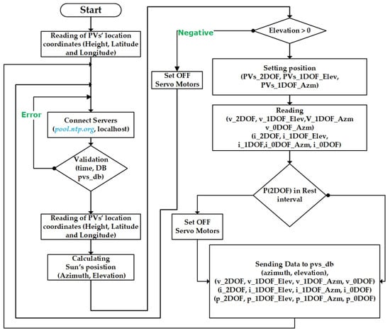 One of the key tasks of this research is the control of the servo motors in the sun tracker using the program based on the C/C++ languages developed in this study, which relies on the astronomical model (Equations (2)–(4)), by converting sun coordinates (azimuth and elevation) into numerical values to control the movement of the PV panels and hence maximize the solar energy capture. This can be achieved through minimizing the incidence angle θ, defined as the angle between the beam radiation on the solar panel surface and the normal to this surface, which is given by Equation (2).